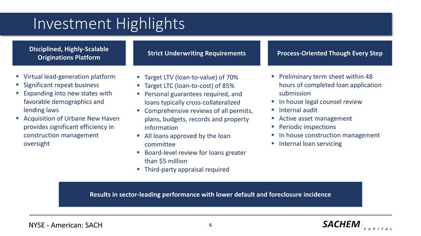 NYSE - American: SACH Competitive Advantage Over 1,550 transactions completed More than $500M in origination since inception Operations in 3 states: TX, CT and FL Conduct lending services in 12 states 5 Favorably Positioned to Grow ▪ Able to structure loans to meet the unique needs and business plans of borrowers ▪ Many banks and other traditional lenders still have restrictive lending criteria ▪ Many non - traditional lenders are undercapitalized ▪ Competitor policies inhibit borrowers’ repeat business ▪ Sachem can move quicker than most financial institutions and non - banking real - estate lenders Proven track record with thousands of completed transactions More than $860M in origination since inception Multi - State Operations Conducting lending across the east coast and southeast