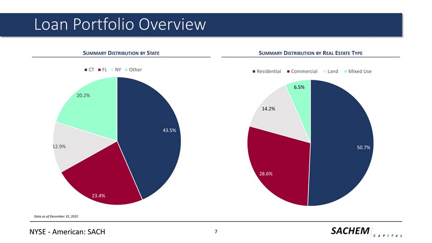 NYSE - American: SACH Investment Highlights ▪ Virtual lead - generation platform ▪ Significant repeat business ▪ Expanding into new states with favorable demographics and lending laws ▪ Acquisition of Urbane New Haven provides significant efficiency in construction management oversight 6 Disciplined, Highly - Scalable Originations Platform Strict Underwriting Requirements Process - Oriented Though Every Step ▪ Preliminary term sheet within 48 hours of completed loan application submission ▪ In house legal counsel review ▪ Internal audit ▪ Active asset management ▪ Periodic inspections ▪ In house construction management ▪ Internal loan servicing ▪ Target LTV (loan - to - value) of 70% ▪ Target LTC (loan - to - cost) of 85% ▪ Personal guarantees required, and loans typically cross - collateralized ▪ Comprehensive reviews of all permits, plans, budgets, records and property information ▪ All loans approved by the loan committee ▪ Board - level review for loans greater than $5 million ▪ Third - party appraisal required Results in sector - leading performance with lower default and foreclosure incidence