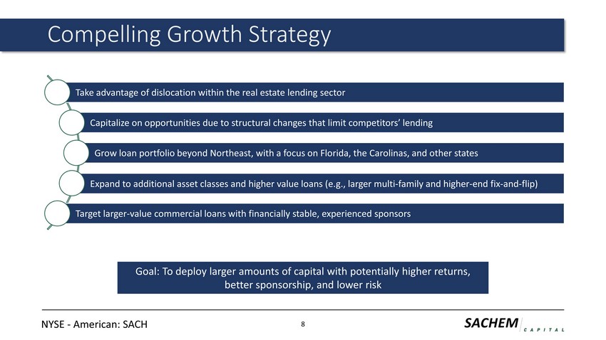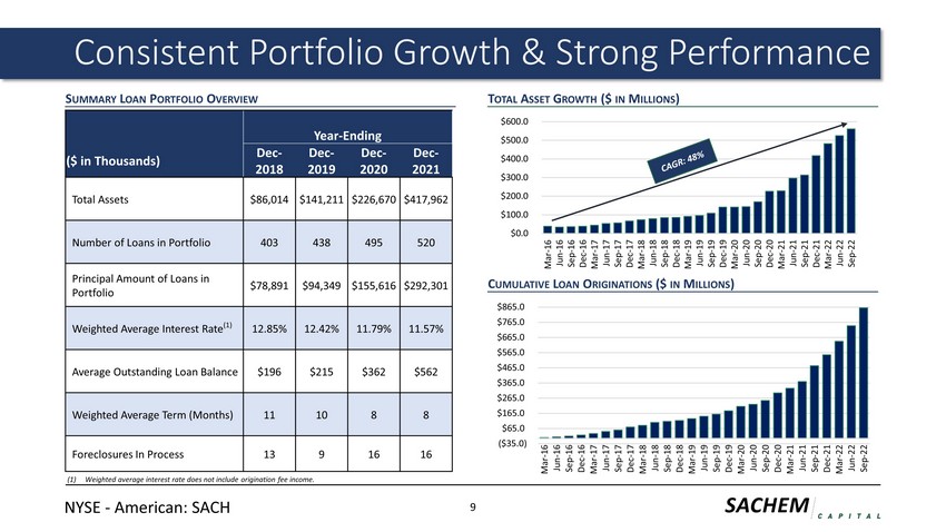 NYSE - American: SACH 8 Goal: To deploy larger amounts of capital with potentially higher returns, better sponsorship, and lower risk Take advantage of dislocation within the real estate lending sector Capitalize on opportunities due to structural changes that limit competitors’ lending Grow loan portfolio beyond Northeast, with a focus on Florida, the Carolinas, and other states Expand to additional asset classes and higher value loans (e.g., larger multi - family and higher - end fix - and - flip) Target larger - value commercial loans with financially stable, experienced sponsors Compelling Growth Strategy