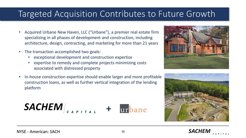 NYSE - American: SACH Consistent Portfolio Growth & Strong Performance 9 (1) Weighted average interest rate does not include origination fee income. S UMMARY L OAN P ORTFOLIO O VERVIEW T OTAL A SSET G ROWTH ($ IN M ILLIONS ) C UMULATIVE L OAN O RIGINATIONS ($ IN M ILLIONS ) Year - Ending ($ in Thousands) Dec - 2018 Dec - 2019 Dec - 2020 Dec - 202 1 Total Assets $86,014 $141,211 $226,670 $ 417,96 2 Number of Loans in Portfolio 403 438 495 520 Principal Amount of Loans in Portfolio $78,891 $94,349 $155,616 $292,301 Weighted Average Interest Rate (1) 12.85% 12.42% 11.79% 11.57% Average Outstanding Loan Balance $196 $215 $362 $562 Weighted Average Term (Months) 11 10 8 8 Foreclosures In Process 13 9 16 16 $0.0 $100.0 $200.0 $300.0 $400.0 $500.0 $600.0 Mar-16 Jun-16 Sep-16 Dec-16 Mar-17 Jun-17 Sep-17 Dec-17 Mar-18 Jun-18 Sep-18 Dec-18 Mar-19 Jun-19 Sep-19 Dec-19 Mar-20 Jun-20 Sep-20 Dec-20 Mar-21 Jun-21 Sep-21 Dec-21 Mar-22 Jun-22 Sep-22 ($35.0) $65.0 $165.0 $265.0 $365.0 $465.0 $565.0 $665.0 $765.0 $865.0 Mar-16 Jun-16 Sep-16 Dec-16 Mar-17 Jun-17 Sep-17 Dec-17 Mar-18 Jun-18 Sep-18 Dec-18 Mar-19 Jun-19 Sep-19 Dec-19 Mar-20 Jun-20 Sep-20 Dec-20 Mar-21 Jun-21 Sep-21 Dec-21 Mar-22 Jun-22 Sep-22