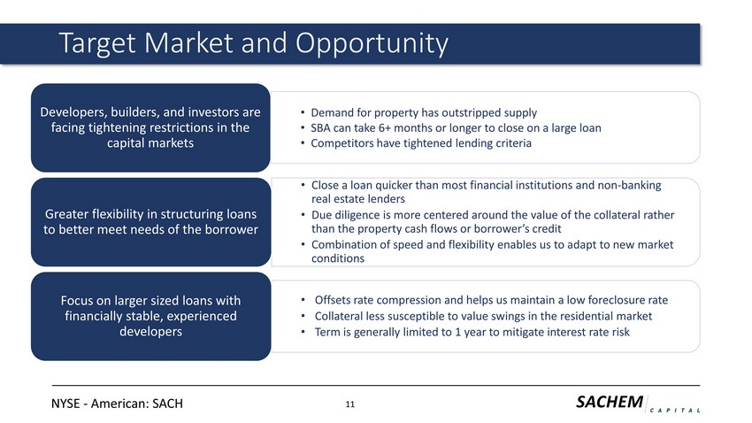 NYSE - American: SACH Targeted Acquisition Contributes to Future Growth 10 • Acquired Urbane New Haven, LLC (“Urbane”), a premier real estate firm specializing in all phases of development and construction, including architecture, design, contracting, and marketing for more than 21 years • The transaction accomplished two goals: • exceptional development and construction expertise • expertise to remedy and complete projects minimizing costs associated with distressed property • In - house construction expertise should enable larger and more profitable construction loans, as well as further vertical integration of the lending platform +