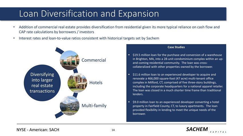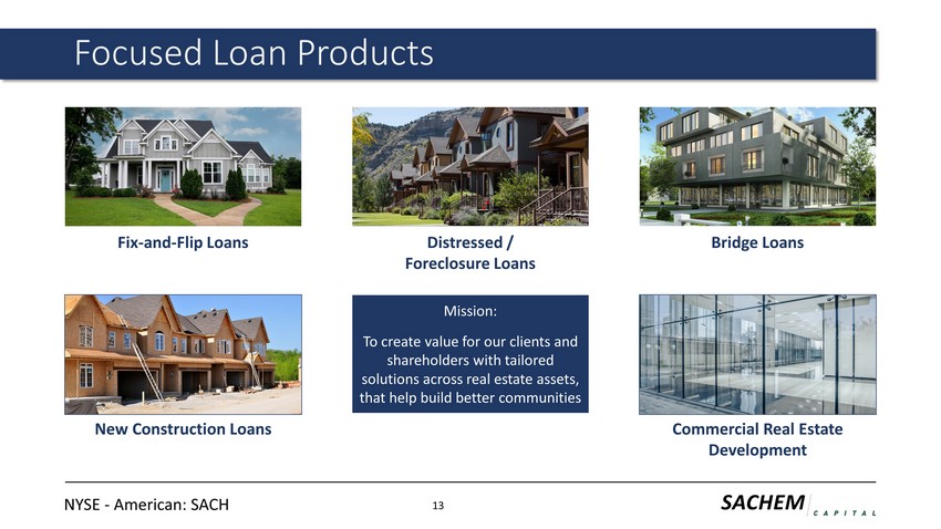 NYSE - American: SACH Focused Loan Products 13 Fix - and - Flip Loans Bridge Loans Distressed / Foreclosure Loans Commercial Real Estate Development New Construction Loans Mission: To create value for our clients and shareholders with tailored solutions across real estate assets, that help build better communities