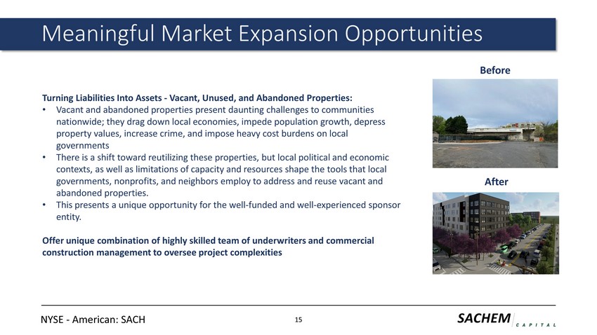 NYSE - American: SACH 15 Turning Liabilities Into Assets - Vacant, Unused, and Abandoned Properties: • Vacant and abandoned properties present daunting challenges to communities nationwide; they drag down local economies, impede population growth, depress property values, increase crime, and impose heavy cost burdens on local governments • There is a shift toward reutilizing these properties, but local political and economic contexts, as well as limitations of capacity and resources shape the tools that local governments, nonprofits, and neighbors employ to address and reuse vacant and abandoned properties. • This presents a unique opportunity for the well - funded and well - experienced sponsor entity. Offer unique combination of highly skilled team of underwriters and commercial construction management to oversee project complexities Before After Meaningful Market Expansion Opportunities