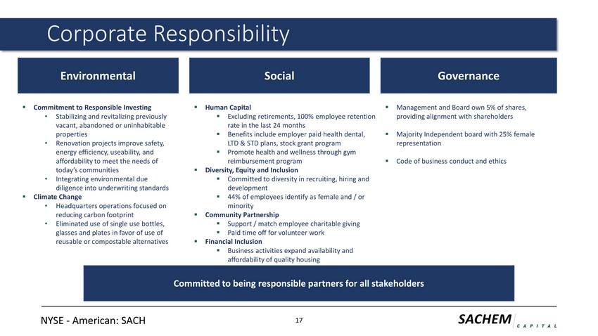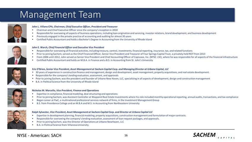 NYSE - American: SACH John L. Villano CPA, Chairman, Chief Executive Officer, President and Treasurer ▪ Chairman and Chief Executive Officer since the company’s inception in 2010 ▪ Responsible for overseeing all aspects of business operations, including loan origination and servicing, investor relations, bra nd development, and business development ▪ Previously engaged in the private practice of accounting and auditing for almost 30 years ▪ Certified Public Accountant and holds a Bachelor’s Degree in Accounting from the University of Rhode Island Management Team 16 John E. Warch , Chief Financial Officer and Executive Vice President ▪ Responsible for overseeing all financial activities, including treasury, control, investments, financial reporting, insurance , t ax, and related functions ▪ Prior to joining Sachem, served as the Chief Financial Officer, Senior Vice President and Treasurer of Four Springs Capital T rus t, a privately - held REIT from 2013 ▪ From 2006 until 2012, John served as Senior Vice President and Chief Accounting Officer of CapLease , Inc. (NYSE: LSE), where he was responsible for all aspects of the financial infrastructure ▪ Certified Public Accountant and holds an M.B.A. in Finance and a B.S. in Accounting from St. John’s University Nicholas M. Marcello, Vice President, Finance and Operations ▪ Expertise in compliance, financial modeling, deal structuring and operations ▪ Prior to joining Sachem, was Assistant Controller at Waypoint Real Estate Investments where his role included monthly operati ona l reporting, annual audits, transactions, and tax compliance ▪ Began career at PwC, a multinational professional services network of firms, in the Investment Management Group ▪ B.S. from Providence College and an M.B.A and M.S. in Accounting from Northeastern University Eric O’Brien, Senior Vice President, Asset Management at Sachem Capital Corp. and Managing Director at Urbane Capital, LLC ▪ 30 years of experience in construction finance and management, design and development, asset management, property acquisition s, and real estate development. ▪ Responsible for the company’s lending evaluation, assessment, and approvals ▪ Prior to joining Sachem, was the president and founder of Urbane New Haven, LLC, specializing in all aspects of development, des ign and construction management ▪ B.A. in Political Science from the University of Rhode Island Ralph Sylvester , Vice President, Asset Management at Sachem Capital Corp. and Director at Urbane Capital LLC ▪ Expertise in development planning, financial modeling, property acquisitions, construction management and formulation of majo r c ontracts. ▪ Responsible for overseeing the company’s lending evaluation, assessment of loan request packages, and approvals. ▪ Prior to joining Sachem, was the Director of Operations at Urbane NewHaven , LLC ▪ B.A. in Political Science from Villanova University.