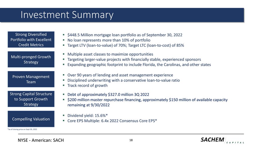 NYSE - American: SACH Corporate Responsibility ▪ Commitment to Responsible Investing • Stabilizing and revitalizing previously vacant, abandoned or uninhabitable properties • Renovation projects improve safety, energy efficiency, useability , and affordability to meet the needs of today’s communities • Integrating environmental due diligence into underwriting standards ▪ Climate Change • Headquarters operations focused on reducing carbon footprint • Eliminated use of single use bottles, glasses and plates in favor of use of reusable or compostable alternatives 17 Environmental Social Governance ▪ Management and Board own 5% of shares, providing alignment with shareholders ▪ Majority Independent board with 25% female representation ▪ Code of business conduct and ethics ▪ Human Capital ▪ Excluding retirements, 100% employee retention rate in the last 24 months ▪ Benefits include employer paid health dental, LTD & STD plans, stock grant program ▪ Promote health and wellness through gym reimbursement program ▪ Diversity, Equity and Inclusion ▪ Committed to diversity in recruiting, hiring and development ▪ 44% of employees identify as female and / or minority ▪ Community Partnership ▪ Support / match employee charitable giving ▪ Paid time off for volunteer work ▪ Financial Inclusion ▪ Business activities expand availability and affordability of quality housing Committed to being responsible partners for all stakeholders
