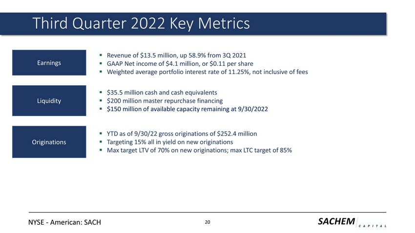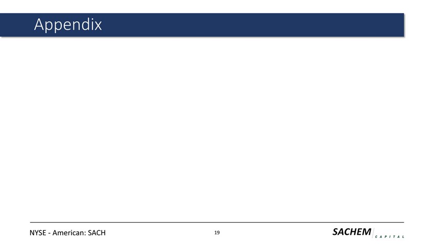NYSE - American: SACH Investment Summary ▪ $448.5 Million mortgage loan portfolio as of September 30, 2022 ▪ No loan represents more than 10% of portfolio ▪ Target LTV (loan - to - value) of 70%; Target LTC (loan - to - cost) of 85% 18 Strong Diversified Portfolio with Excellent Credit Metrics Multi - pronged Growth Strategy Proven Management Team Strong Capital Structure to Support Growth Strategy Compelling Valuation ▪ Dividend yield: 15.6%* ▪ Core EPS Multiple: 6.4x 2022 Consensus Core EPS* ▪ Debt of approximately $327.0 million 3Q 2022 ▪ $200 million master repurchase financing, approximately $150 million of available capacity remaining at 9/30/2022 ▪ Multiple asset classes to maximize opportunities ▪ Targeting larger - value projects with financially stable, experienced sponsors ▪ Expanding geographic footprint to include Florida, the Carolinas, and other states ▪ Over 90 years of lending and asset management experience ▪ Disciplined underwriting with a conservative loan - to - value ratio ▪ Track record of growth *as of closing price on Sept 30, 2022