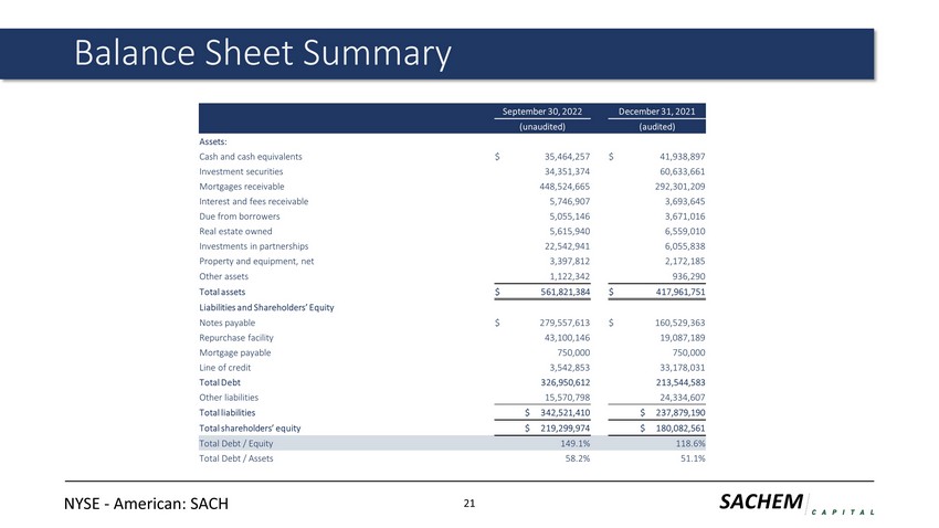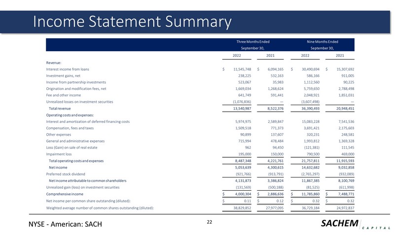 NYSE - American: SACH Balance Sheet Summary 21 September 30, 2022 December 31, 2021 (unaudited) (audited) Assets: Cash and cash equivalents $ 35,464,257 $ 41,938,897 Investment securities 34,351,374 60,633,661 Mortgages receivable 448,524,665 292,301,209 Interest and fees receivable 5,746,907 3,693,645 Due from borrowers 5,055,146 3,671,016 Real estate owned 5,615,940 6,559,010 Investments in partnerships 22,542,941 6,055,838 Property and equipment, net 3,397,812 2,172,185 Other assets 1,122,342 936,290 Total assets $ 561,821,384 $ 417,961,751 Liabilities and Shareholders’ Equity Notes payable $ 279,557,613 $ 160,529,363 Repurchase facility 43,100,146 19,087,189 Mortgage payable 750,000 750,000 Line of credit 3,542,853 33,178,031 Total Debt 326,950,612 213,544,583 Other liabilities 15,570,798 24,334,607 Total liabilities $ 342,521,410 $ 237,879,190 Total shareholders’ equity $ 219,299,974 $ 180,082,561 Total Debt / Equity 149.1% 118.6% Total Debt / Assets 58.2% 51.1%