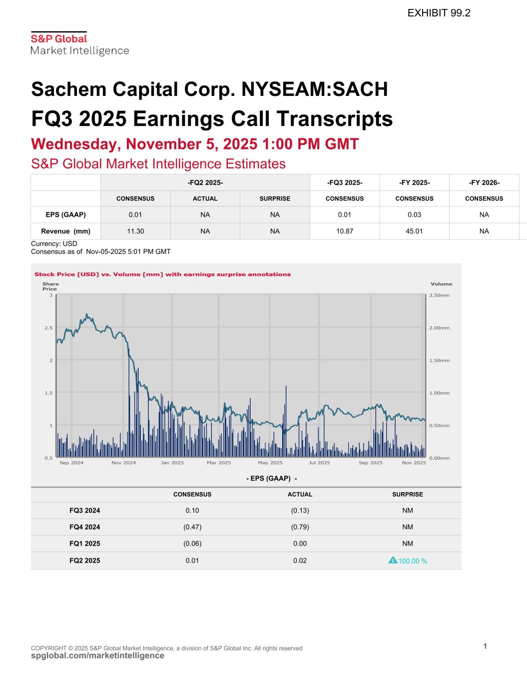 COPYRIGHT © 2025 S&P Global Market Intelligence, a division of S&P Global Inc. All rights reserved spglobal.com/marketintelligence 1 Sachem Capital Corp. NYSEAM:SACH FQ3 2025 Earnings Call Transcripts Wednesday, November 5, 2025 1:00 PM GMT S&P Global Market Intelligence Estimates -FQ2 2025- -FQ3 2025- -FY 2025- -FY 2026- CONSENSUS ACTUAL SURPRISE CONSENSUS CONSENSUS CONSENSUS EPS (GAAP) 0.01 NA NA 0.01 0.03 NA NA 0.07 Revenue (mm) 11.30 NA NA 10.87 45.01 NA NA 44.27 Currency: USD Consensus as of Nov-05-2025 5:01 PM GMT - EPS (GAAP) - CONSENSUS ACTUAL SURPRISE FQ3 2024 0.10 (0.13) NM FQ4 2024 (0.47) (0.79) NM FQ1 2025 (0.06) 0.00 NM FQ2 2025 0.01 0.02 100.00 % EXHIBIT 99.2
