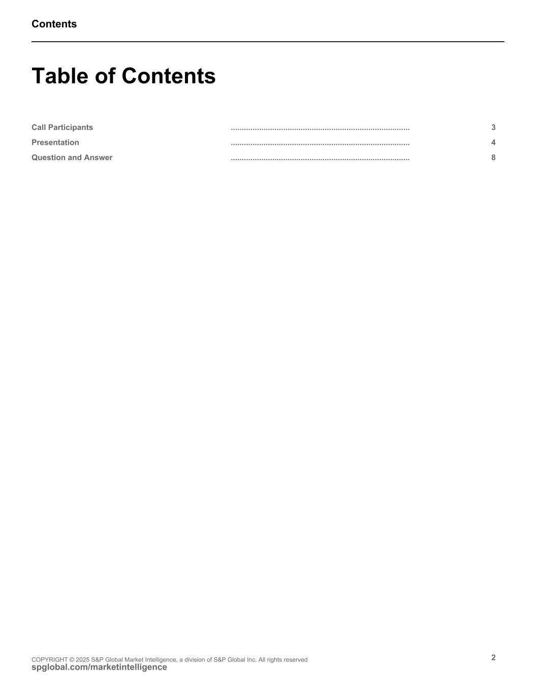 Contents COPYRIGHT © 2025 S&P Global Market Intelligence, a division of S&P Global Inc. All rights reserved spglobal.com/marketintelligence 2 Table of Contents Call Participants .................................................................................. 3 Presentation .................................................................................. 4 Question and Answer .................................................................................. 8