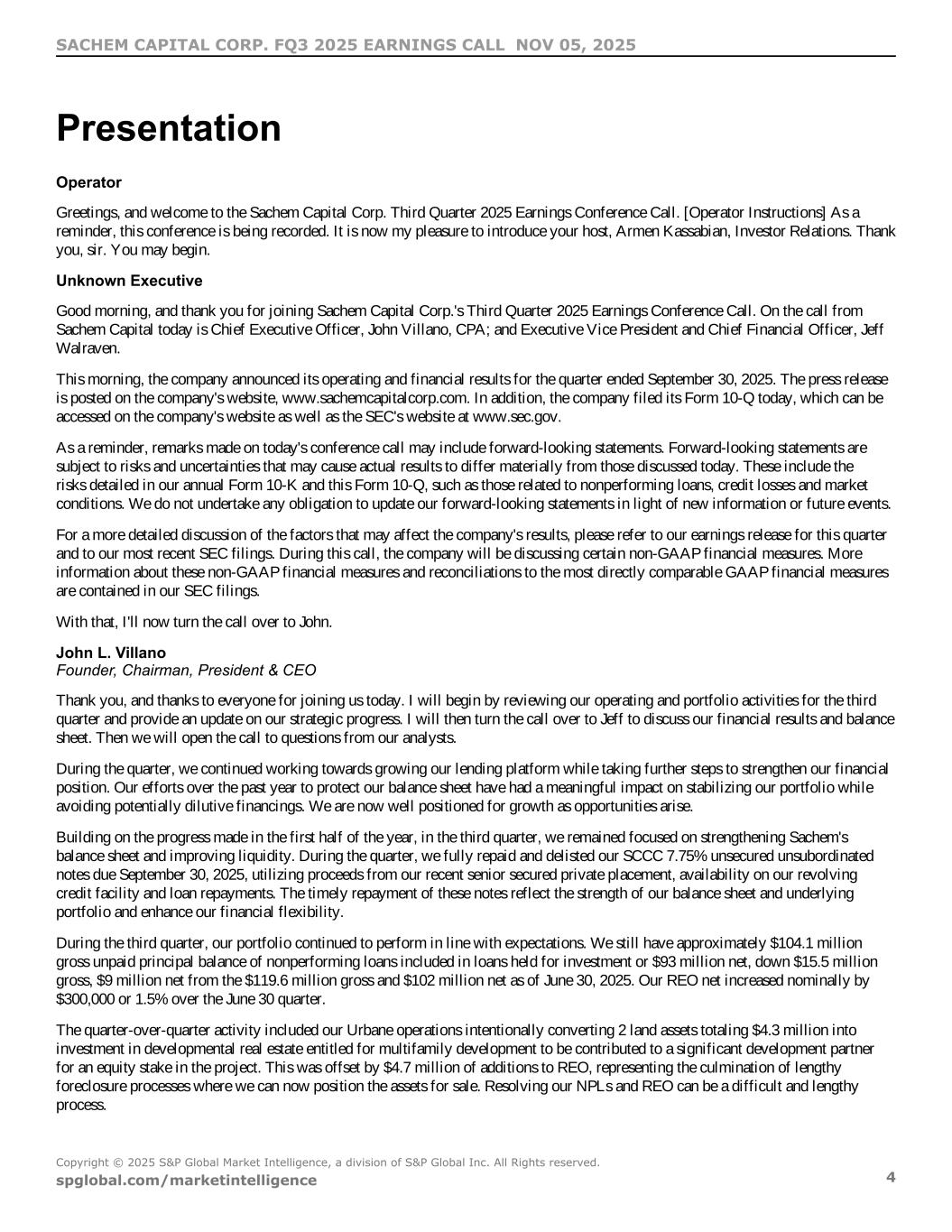 SACHEM CAPITAL CORP. FQ3 2025 EARNINGS CALL NOV 05, 2025 Copyright © 2025 S&P Global Market Intelligence, a division of S&P Global Inc. All Rights reserved. spglobal.com/marketintelligence 4 Presentation Operator Greetings, and welcome to the Sachem Capital Corp. Third Quarter 2025 Earnings Conference Call. [Operator Instructions] As a reminder, this conference is being recorded. It is now my pleasure to introduce your host, Armen Kassabian, Investor Relations. Thank you, sir. You may begin. Unknown Executive Good morning, and thank you for joining Sachem Capital Corp.'s Third Quarter 2025 Earnings Conference Call. On the call from Sachem Capital today is Chief Executive Officer, John Villano, CPA; and Executive Vice President and Chief Financial Officer, Jeff Walraven. This morning, the company announced its operating and financial results for the quarter ended September 30, 2025. The press release is posted on the company's website, www.sachemcapitalcorp.com. In addition, the company filed its Form 10-Q today, which can be accessed on the company's website as well as the SEC's website at www.sec.gov. As a reminder, remarks made on today's conference call may include forward-looking statements. Forward-looking statements are subject to risks and uncertainties that may cause actual results to differ materially from those discussed today. These include the risks detailed in our annual Form 10-K and this Form 10-Q, such as those related to nonperforming loans, credit losses and market conditions. We do not undertake any obligation to update our forward-looking statements in light of new information or future events. For a more detailed discussion of the factors that may affect the company's results, please refer to our earnings release for this quarter and to our most recent SEC filings. During this call, the company will be discussing certain non-GAAP financial measures. More information about these non-GAAP financial measures and reconciliations to the most directly comparable GAAP financial measures are contained in our SEC filings. With that, I'll now turn the call over to John. John L. Villano Founder, Chairman, President & CEO Thank you, and thanks to everyone for joining us today. I will begin by reviewing our operating and portfolio activities for the third quarter and provide an update on our strategic progress. I will then turn the call over to Jeff to discuss our financial results and balance sheet. Then we will open the call to questions from our analysts. During the quarter, we continued working towards growing our lending platform while taking further steps to strengthen our financial position. Our efforts over the past year to protect our balance sheet have had a meaningful impact on stabilizing our portfolio while avoiding potentially dilutive financings. We are now well positioned for growth as opportunities arise. Building on the progress made in the first half of the year, in the third quarter, we remained focused on strengthening Sachem's balance sheet and improving liquidity. During the quarter, we fully repaid and delisted our SCCC 7.75% unsecured unsubordinated notes due September 30, 2025, utilizing proceeds from our recent senior secured private placement, availability on our revolving credit facility and loan repayments. The timely repayment of these notes reflect the strength of our balance sheet and underlying portfolio and enhance our financial flexibility. During the third quarter, our portfolio continued to perform in line with expectations. We still have approximately $104.1 million gross unpaid principal balance of nonperforming loans included in loans held for investment or $93 million net, down $15.5 million gross, $9 million net from the $119.6 million gross and $102 million net as of June 30, 2025. Our REO net increased nominally by $300,000 or 1.5% over the June 30 quarter. The quarter-over-quarter activity included our Urbane operations intentionally converting 2 land assets totaling $4.3 million into investment in developmental real estate entitled for multifamily development to be contributed to a significant development partner for an equity stake in the project. This was offset by $4.7 million of additions to REO, representing the culmination of lengthy foreclosure processes where we can now position the assets for sale. Resolving our NPLs and REO can be a difficult and lengthy process.