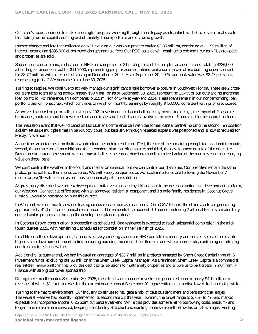 SACHEM CAPITAL CORP. FQ3 2025 EARNINGS CALL NOV 05, 2025 Copyright © 2025 S&P Global Market Intelligence, a division of S&P Global Inc. All Rights reserved. spglobal.com/marketintelligence 5 Our team's focus continues to make meaningful progress working through these legacy assets, which we believe is a critical step to facilitating further capital sourcing and ultimately, future portfolio and dividend growth. Interest charges and late fees collected on NPLs during our workout process totaled $2.35 million, consisting of $1.95 million of interest income and $396,000 of borrower charges and late fees. Our REO balance will continue to ebb and flow as NPLs are added and properties are sold. Subsequent to quarter end, reductions in REO are comprised of 2 building lots sold at par plus accrued interest totaling $226,000, a building lot under contract for $115,000, representing par plus accrued interest and a commercial office building under contract for $3.72 million with an expected closing in December of 2025. As of September 30, 2025, our book value was $2.47 per share, representing just a 2.8% decrease from June 30, 2025. Turning to Naples. We continue to actively manage our significant single borrower exposure in Southwest Florida. These are 2 cross- collateralized loans totaling approximately $50.4 million as of September 30, 2025, representing 13.4% of our outstanding mortgage loan portfolio. For reference, this compares to $55 million or 14% at year-end 2024. These loans remain in our nonperforming loan portfolio and on nonaccrual, which continues to weigh on monthly earnings by roughly $450,000, consistent with prior disclosures. As we've discussed on prior calls, this legacy 2021 investment has been challenged by permitting delays, the impact of 2 separate hurricanes, contractor and borrower performance issues and legal disputes involving the city of Naples and former capital partners. The mediation event that we indicated on last quarter's conference call with the former capital partner holding the second lien position, a claim set aside multiple times in bankruptcy court, but kept alive through repeated appeals was postponed and is now scheduled for Friday, November 7. A constructive outcome at mediation would clear the path to resolution. First, the sale of the remaining completed condominium units; second, the completion of an additional 4-unit condominium building on site; and third, the development or sale of the other site. Based on our current assessment, we continue to believe the consolidated cross-collateralized value of the assets exceeds our carrying value on these loans. We can't control the weather or the court and mediation calendar, but we can control our discipline. Our priorities remain the same: protect principal first, then monetize value. We will keep you apprised as we reach milestones and following the November 7 mediation, we'll evaluate the fastest, most economical path to resolution. As previously disclosed, we have 4 development initiatives managed by Urbane, our in-house construction and development platform, our Westport, Connecticut office asset with an approved residential component and 3 single-family residences in Coconut Grove, Florida. Execution remained on plan this quarter. In Westport, we continue to advance leasing discussions to increase occupancy. On a GAAP basis, the office assets are generating approximately $1.3 million of annual rental income. The residential component, 10 homes, including 2 affordable units remains fully entitled and is progressing through the development planning phase. In Coconut Grove, construction is proceeding as scheduled. One residence is expected to reach substantial completion in the mid- fourth quarter 2025, with remaining 2 scheduled for completion in the first half of 2026. In addition to these developments, Urbane is actively working across our REO portfolio to identify and convert selected assets into higher-value development opportunities, including pursuing incremental entitlements and where appropriate, continuing or initiating construction to enhance value. Additionally, at quarter end, we had invested an aggregate of $33.7 million in projects managed by Shem Creek Capital through 6 investment funds, excluding our $5 million in the Shem Creek Capital Manager. As a reminder, Shem Creek Capitalis a commercial real estate finance platform that provides debt capital solutions to multifamily properties and allows us to participate in multifamily finance with strong borrower sponsorship. During the 9 months ended September 30, 2025, these funds and manager investments generated approximately $4.1 million in revenue, of which $1.1 million was for the current quarter ended September 30, representing an attractive low-risk double-digit yield. Turning to the macro environment. Our industry continues to navigate a mix of cautious sentiment and persistent challenges. The Federal Reserve has recently implemented its second rate cut this year, lowering the target range to 3.75% to 4% and market expectations incorporate another 0.25 point cut before year-end. While this provides some relief to borrowing costs, medium- and longer-term rates remain elevated, keeping affordability stretched and existing home sales well below historical averages. Renting