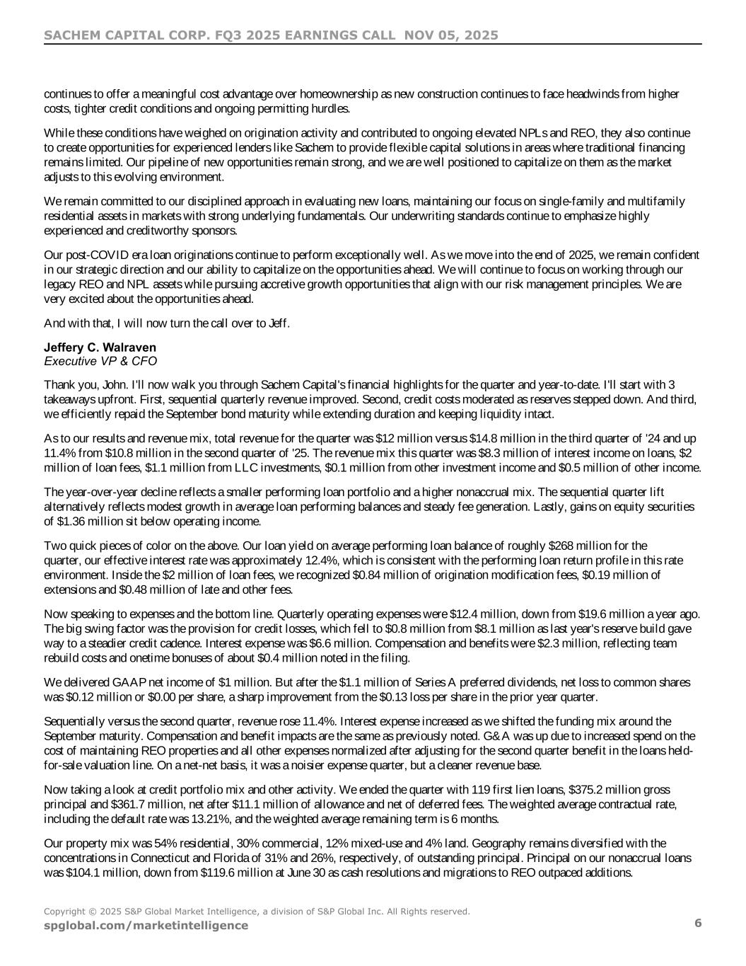 SACHEM CAPITAL CORP. FQ3 2025 EARNINGS CALL NOV 05, 2025 Copyright © 2025 S&P Global Market Intelligence, a division of S&P Global Inc. All Rights reserved. spglobal.com/marketintelligence 6 continues to offer a meaningful cost advantage over homeownership as new construction continues to face headwinds from higher costs, tighter credit conditions and ongoing permitting hurdles. While these conditions have weighed on origination activity and contributed to ongoing elevated NPLs and REO, they also continue to create opportunities for experienced lenders like Sachem to provide flexible capital solutions in areas where traditional financing remains limited. Our pipeline of new opportunities remain strong, and we are well positioned to capitalize on them as the market adjusts to this evolving environment. We remain committed to our disciplined approach in evaluating new loans, maintaining our focus on single-family and multifamily residential assets in markets with strong underlying fundamentals. Our underwriting standards continue to emphasize highly experienced and creditworthy sponsors. Our post-COVID era loan originations continue to perform exceptionally well. As we move into the end of 2025, we remain confident in our strategic direction and our ability to capitalize on the opportunities ahead. We will continue to focus on working through our legacy REO and NPL assets while pursuing accretive growth opportunities that align with our risk management principles. We are very excited about the opportunities ahead. And with that, I will now turn the call over to Jeff. Jeffery C. Walraven Executive VP & CFO Thank you, John. I'll now walk you through Sachem Capital's financial highlights for the quarter and year-to-date. I'll start with 3 takeaways upfront. First, sequential quarterly revenue improved. Second, credit costs moderated as reserves stepped down. And third, we efficiently repaid the September bond maturity while extending duration and keeping liquidity intact. As to our results and revenue mix, total revenue for the quarter was $12 million versus $14.8 million in the third quarter of '24 and up 11.4% from $10.8 million in the second quarter of '25. The revenue mix this quarter was $8.3 million of interest income on loans, $2 million of loan fees, $1.1 million from LLC investments, $0.1 million from other investment income and $0.5 million of other income. The year-over-year decline reflects a smaller performing loan portfolio and a higher nonaccrual mix. The sequential quarter lift alternatively reflects modest growth in average loan performing balances and steady fee generation. Lastly, gains on equity securities of $1.36 million sit below operating income. Two quick pieces of color on the above. Our loan yield on average performing loan balance of roughly $268 million for the quarter, our effective interest rate was approximately 12.4%, which is consistent with the performing loan return profile in this rate environment. Inside the $2 million of loan fees, we recognized $0.84 million of origination modification fees, $0.19 million of extensions and $0.48 million of late and other fees. Now speaking to expenses and the bottom line. Quarterly operating expenses were $12.4 million, down from $19.6 million a year ago. The big swing factor was the provision for credit losses, which fell to $0.8 million from $8.1 million as last year's reserve build gave way to a steadier credit cadence. Interest expense was $6.6 million. Compensation and benefits were $2.3 million, reflecting team rebuild costs and onetime bonuses of about $0.4 million noted in the filing. We delivered GAAP net income of $1 million. But after the $1.1 million of Series A preferred dividends, net loss to common shares was $0.12 million or $0.00 per share, a sharp improvement from the $0.13 loss per share in the prior year quarter. Sequentially versus the second quarter, revenue rose 11.4%. Interest expense increased as we shifted the funding mix around the September maturity. Compensation and benefit impacts are the same as previously noted. G&A was up due to increased spend on the cost of maintaining REO properties and all other expenses normalized after adjusting for the second quarter benefit in the loans held- for-sale valuation line. On a net-net basis, it was a noisier expense quarter, but a cleaner revenue base. Now taking a look at credit portfolio mix and other activity. We ended the quarter with 119 first lien loans, $375.2 million gross principal and $361.7 million, net after $11.1 million of allowance and net of deferred fees. The weighted average contractual rate, including the default rate was 13.21%, and the weighted average remaining term is 6 months. Our property mix was 54% residential, 30% commercial, 12% mixed-use and 4% land. Geography remains diversified with the concentrations in Connecticut and Florida of 31% and 26%, respectively, of outstanding principal. Principal on our nonaccrual loans was $104.1 million, down from $119.6 million at June 30 as cash resolutions and migrations to REO outpaced additions.