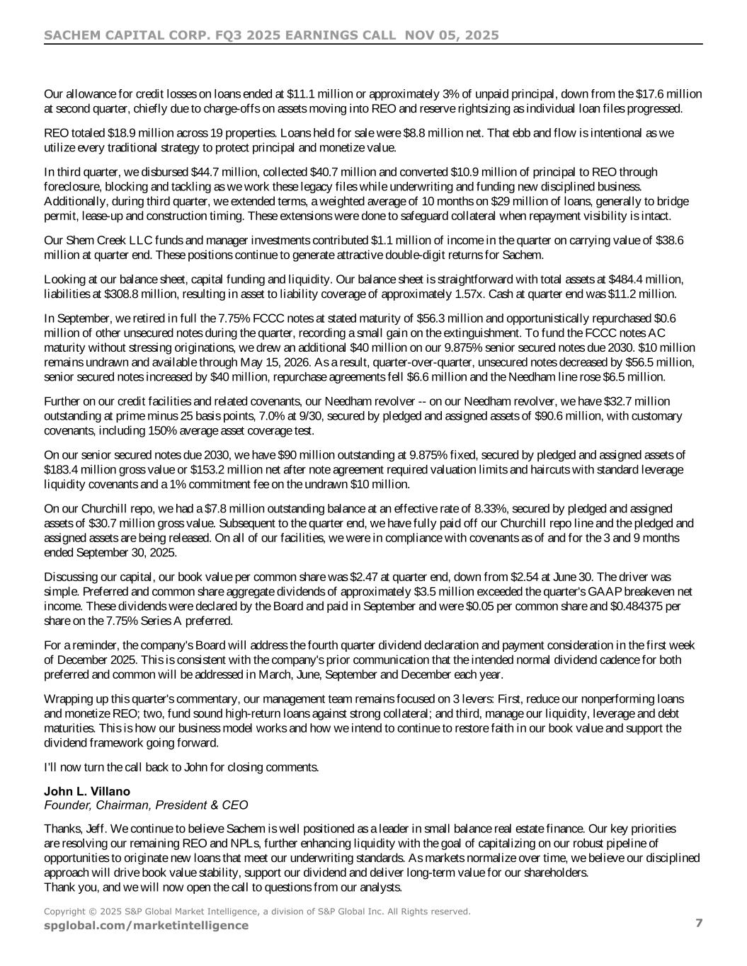 SACHEM CAPITAL CORP. FQ3 2025 EARNINGS CALL NOV 05, 2025 Copyright © 2025 S&P Global Market Intelligence, a division of S&P Global Inc. All Rights reserved. spglobal.com/marketintelligence 7 Our allowance for credit losses on loans ended at $11.1 million or approximately 3% of unpaid principal, down from the $17.6 million at second quarter, chiefly due to charge-offs on assets moving into REO and reserve rightsizing as individual loan files progressed. REO totaled $18.9 million across 19 properties. Loans held for sale were $8.8 million net. That ebb and flow is intentional as we utilize every traditional strategy to protect principal and monetize value. In third quarter, we disbursed $44.7 million, collected $40.7 million and converted $10.9 million of principal to REO through foreclosure, blocking and tackling as we work these legacy files while underwriting and funding new disciplined business. Additionally, during third quarter, we extended terms, a weighted average of 10 months on $29 million of loans, generally to bridge permit, lease-up and construction timing. These extensions were done to safeguard collateral when repayment visibility is intact. Our Shem Creek LLC funds and manager investments contributed $1.1 million of income in the quarter on carrying value of $38.6 million at quarter end. These positions continue to generate attractive double-digit returns for Sachem. Looking at our balance sheet, capital funding and liquidity. Our balance sheet is straightforward with total assets at $484.4 million, liabilities at $308.8 million, resulting in asset to liability coverage of approximately 1.57x. Cash at quarter end was $11.2 million. In September, we retired in full the 7.75% FCCC notes at stated maturity of $56.3 million and opportunistically repurchased $0.6 million of other unsecured notes during the quarter, recording a small gain on the extinguishment. To fund the FCCC notes AC maturity without stressing originations, we drew an additional $40 million on our 9.875% senior secured notes due 2030. $10 million remains undrawn and available through May 15, 2026. As a result, quarter-over-quarter, unsecured notes decreased by $56.5 million, senior secured notes increased by $40 million, repurchase agreements fell $6.6 million and the Needham line rose $6.5 million. Further on our credit facilities and related covenants, our Needham revolver -- on our Needham revolver, we have $32.7 million outstanding at prime minus 25 basis points, 7.0% at 9/30, secured by pledged and assigned assets of $90.6 million, with customary covenants, including 150% average asset coverage test. On our senior secured notes due 2030, we have $90 million outstanding at 9.875% fixed, secured by pledged and assigned assets of $183.4 million gross value or $153.2 million net after note agreement required valuation limits and haircuts with standard leverage liquidity covenants and a 1% commitment fee on the undrawn $10 million. On our Churchill repo, we had a $7.8 million outstanding balance at an effective rate of 8.33%, secured by pledged and assigned assets of $30.7 million gross value. Subsequent to the quarter end, we have fully paid off our Churchill repo line and the pledged and assigned assets are being released. On all of our facilities, we were in compliance with covenants as of and for the 3 and 9 months ended September 30, 2025. Discussing our capital, our book value per common share was $2.47 at quarter end, down from $2.54 at June 30. The driver was simple. Preferred and common share aggregate dividends of approximately $3.5 million exceeded the quarter's GAAP breakeven net income. These dividends were declared by the Board and paid in September and were $0.05 per common share and $0.484375 per share on the 7.75% Series A preferred. For a reminder, the company's Board will address the fourth quarter dividend declaration and payment consideration in the first week of December 2025. This is consistent with the company's prior communication that the intended normal dividend cadence for both preferred and common will be addressed in March, June, September and December each year. Wrapping up this quarter's commentary, our management team remains focused on 3 levers: First, reduce our nonperforming loans and monetize REO; two, fund sound high-return loans against strong collateral; and third, manage our liquidity, leverage and debt maturities. This is how our business model works and how we intend to continue to restore faith in our book value and support the dividend framework going forward. I'll now turn the call back to John for closing comments. John L. Villano Founder, Chairman, President & CEO Thanks, Jeff. We continue to believe Sachem is well positioned as a leader in small balance real estate finance. Our key priorities are resolving our remaining REO and NPLs, further enhancing liquidity with the goal of capitalizing on our robust pipeline of opportunities to originate new loans that meet our underwriting standards. As markets normalize over time, we believe our disciplined approach will drive book value stability, support our dividend and deliver long-term value for our shareholders. Thank you, and we will now open the call to questions from our analysts.