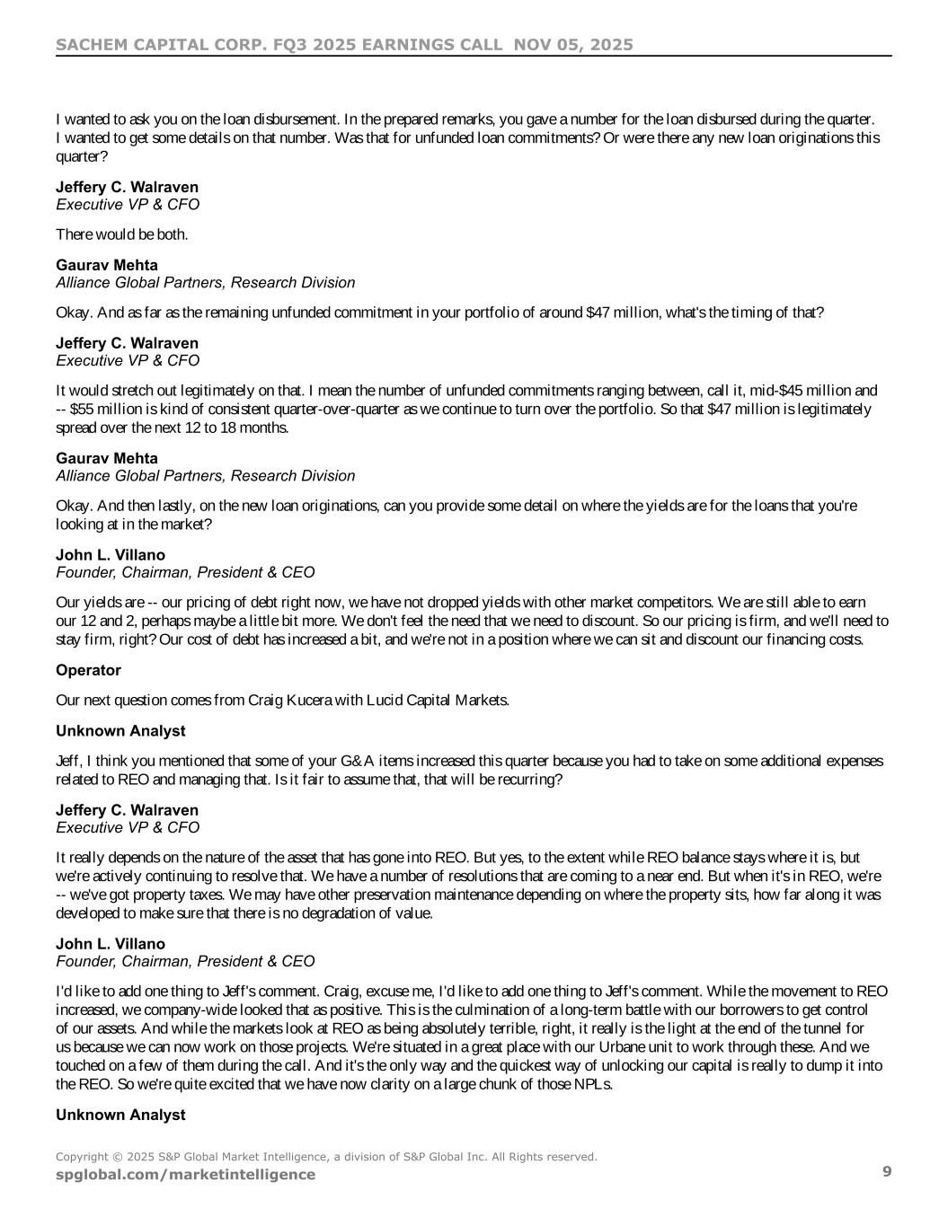 SACHEM CAPITAL CORP. FQ3 2025 EARNINGS CALL NOV 05, 2025 Copyright © 2025 S&P Global Market Intelligence, a division of S&P Global Inc. All Rights reserved. spglobal.com/marketintelligence 9 I wanted to ask you on the loan disbursement. In the prepared remarks, you gave a number for the loan disbursed during the quarter. I wanted to get some details on that number. Was that for unfunded loan commitments? Or were there any new loan originations this quarter? Jeffery C. Walraven Executive VP & CFO There would be both. Gaurav Mehta Alliance Global Partners, Research Division Okay. And as far as the remaining unfunded commitment in your portfolio of around $47 million, what's the timing of that? Jeffery C. Walraven Executive VP & CFO It would stretch out legitimately on that. I mean the number of unfunded commitments ranging between, call it, mid-$45 million and -- $55 million is kind of consistent quarter-over-quarter as we continue to turn over the portfolio. So that $47 million is legitimately spread over the next 12 to 18 months. Gaurav Mehta Alliance Global Partners, Research Division Okay. And then lastly, on the new loan originations, can you provide some detail on where the yields are for the loans that you're looking at in the market? John L. Villano Founder, Chairman, President & CEO Our yields are -- our pricing of debt right now, we have not dropped yields with other market competitors. We are still able to earn our 12 and 2, perhaps maybe a little bit more. We don't feel the need that we need to discount. So our pricing is firm, and we'll need to stay firm, right? Our cost of debt has increased a bit, and we're not in a position where we can sit and discount our financing costs. Operator Our next question comes from Craig Kucera with Lucid Capital Markets. Unknown Analyst Jeff, I think you mentioned that some of your G&A items increased this quarter because you had to take on some additional expenses related to REO and managing that. Is it fair to assume that, that will be recurring? Jeffery C. Walraven Executive VP & CFO It really depends on the nature of the asset that has gone into REO. But yes, to the extent while REO balance stays where it is, but we're actively continuing to resolve that. We have a number of resolutions that are coming to a near end. But when it's in REO, we're -- we've got property taxes. We may have other preservation maintenance depending on where the property sits, how far along it was developed to make sure that there is no degradation of value. John L. Villano Founder, Chairman, President & CEO I'd like to add one thing to Jeff's comment. Craig, excuse me, I'd like to add one thing to Jeff's comment. While the movement to REO increased, we company-wide looked that as positive. This is the culmination of a long-term battle with our borrowers to get control of our assets. And while the markets look at REO as being absolutely terrible, right, it really is the light at the end of the tunnel for us because we can now work on those projects. We're situated in a great place with our Urbane unit to work through these. And we touched on a few of them during the call. And it's the only way and the quickest way of unlocking our capital is really to dump it into the REO. So we're quite excited that we have now clarity on a large chunk of those NPLs. Unknown Analyst