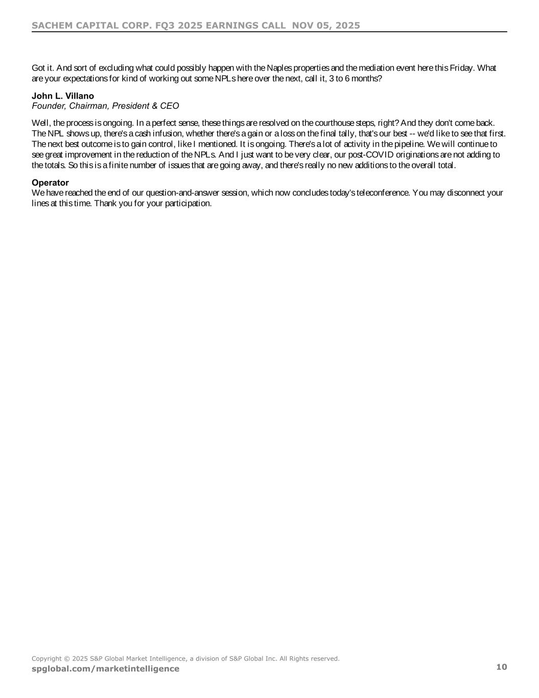 SACHEM CAPITAL CORP. FQ3 2025 EARNINGS CALL NOV 05, 2025 Copyright © 2025 S&P Global Market Intelligence, a division of S&P Global Inc. All Rights reserved. spglobal.com/marketintelligence 10 Got it. And sort of excluding what could possibly happen with the Naples properties and the mediation event here this Friday. What are your expectations for kind of working out some NPLs here over the next, call it, 3 to 6 months? John L. Villano Founder, Chairman, President & CEO Well, the process is ongoing. In a perfect sense, these things are resolved on the courthouse steps, right? And they don't come back. The NPL shows up, there's a cash infusion, whether there's a gain or a loss on the final tally, that's our best -- we'd like to see that first. The next best outcome is to gain control, like I mentioned. It is ongoing. There's a lot of activity in the pipeline. We will continue to see great improvement in the reduction of the NPLs. And I just want to be very clear, our post-COVID originations are not adding to the totals. So this is a finite number of issues that are going away, and there's really no new additions to the overall total. Operator We have reached the end of our question-and-answer session, which now concludes today's teleconference. You may disconnect your lines at this time. Thank you for your participation.