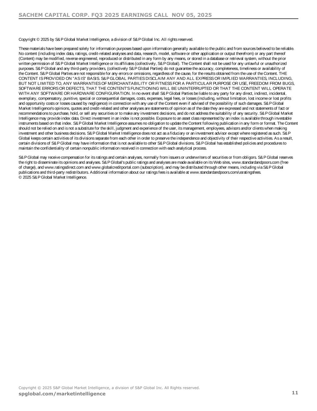 SACHEM CAPITAL CORP. FQ3 2025 EARNINGS CALL NOV 05, 2025 Copyright © 2025 S&P Global Market Intelligence, a division of S&P Global Inc. All Rights reserved. spglobal.com/marketintelligence 11 Copyright © 2025 by S&P Global Market Intelligence, a division of S&P Global Inc. All rights reserved. These materials have been prepared solely for information purposes based upon information generally available to the public and from sources believed to be reliable. No content (including index data, ratings, credit-related analyses and data, research, model, software or other application or output therefrom) or any part thereof (Content) may be modified, reverse engineered, reproduced or distributed in any form by any means, or stored in a database or retrieval system, without the prior written permission of S&P Global Market Intelligence or its affiliates (collectively, S&P Global). The Content shall not be used for any unlawful or unauthorized purposes. S&P Global and any third-party providers, (collectively S&P Global Parties) do not guarantee the accuracy, completeness, timeliness or availability of the Content. S&P Global Parties are not responsible for any errors or omissions, regardless of the cause, for the results obtained from the use of the Content. THE CONTENT IS PROVIDED ON "AS IS" BASIS. S&P GLOBAL PARTIES DISCLAIM ANY AND ALL EXPRESS OR IMPLIED WARRANTIES, INCLUDING, BUT NOT LIMITED TO, ANY WARRANTIES OF MERCHANTABILITY OR FITNESS FOR A PARTICULAR PURPOSE OR USE, FREEDOM FROM BUGS, SOFTWARE ERRORS OR DEFECTS, THAT THE CONTENT'S FUNCTIONING WILL BE UNINTERRUPTED OR THAT THE CONTENT WILL OPERATE WITH ANY SOFTWARE OR HARDWARE CONFIGURATION. In no event shall S&P Global Parties be liable to any party for any direct, indirect, incidental, exemplary, compensatory, punitive, special or consequential damages, costs, expenses, legal fees, or losses (including, without limitation, lost income or lost profits and opportunity costs or losses caused by negligence) in connection with any use of the Content even if advised of the possibility of such damages. S&P Global Market Intelligence's opinions, quotes and credit-related and other analyses are statements of opinion as of the date they are expressed and not statements of fact or recommendations to purchase, hold, or sell any securities or to make any investment decisions, and do not address the suitability of any security. S&P Global Market Intelligence may provide index data. Direct investment in an index is not possible. Exposure to an asset class represented by an index is available through investable instruments based on that index. S&P Global Market Intelligence assumes no obligation to update the Content following publication in any form or format. The Content should not be relied on and is not a substitute for the skill, judgment and experience of the user, its management, employees, advisors and/or clients when making investment and other business decisions. S&P Global Market Intelligence does not act as a fiduciary or an investment advisor except where registered as such. S&P Global keeps certain activities of its divisions separate from each other in order to preserve the independence and objectivity of their respective activities. As a result, certain divisions of S&P Global may have information that is not available to other S&P Global divisions. S&P Global has established policies and procedures to maintain the confidentiality of certain nonpublic information received in connection with each analytical process. S&P Global may receive compensation for its ratings and certain analyses, normally from issuers or underwriters of securities or from obligors. S&P Global reserves the right to disseminate its opinions and analyses. S&P Global's public ratings and analyses are made available on its Web sites, www.standardandpoors.com (free of charge), and www.ratingsdirect.com and www.globalcreditportal.com (subscription), and may be distributed through other means, including via S&P Global publications and third-party redistributors. Additional information about our ratings fees is available at www.standardandpoors.com/usratingsfees. © 2025 S&P Global Market Intelligence.