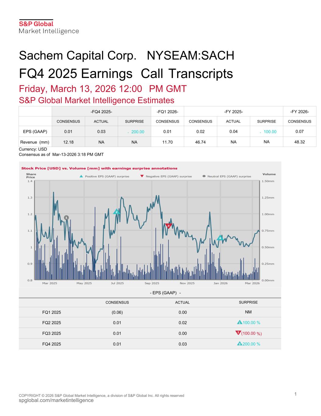 Sachem Capital Corp. FQ4 2025 Earnings Call Friday, March 13, 2026 12:00 PM GMT S&P Global Market Intelligence Estimates -FQ4 2025- -FQ1 2026- CONSENSUS ACTUAL SURPRISE CONSENSUS CONSENSUS EPS (GAAP) 0.01 0.03 200.00 0.01 0.02 Revenue (mm) 12.18 NA NA 11.70 46.74 Currency: USD Consensus as of Mar-13-2026 3:18 PM GMT - EPS (GAAP) - CONSENSUS ACTUAL FQ1 2025 (0.06) 0.00 FQ2 2025 0.01 0.02 FQ3 2025 0.01 0.00 FQ4 2025 0.01 0.03 -FY 2025- ACTUAL 0.04 NA SURPRISE NM 100.00 % (100.00 200.00 % 100.00 NA -FY 2026- 0.07 48.32 1 NYSEAM:SACH Transcripts SURPRISE CONSENSUS %) COPYRIGHT spglobal.com/marketintelligence © 2026 S&P Global Market Intelligence, a division of S&P Global Inc. All rights reserved