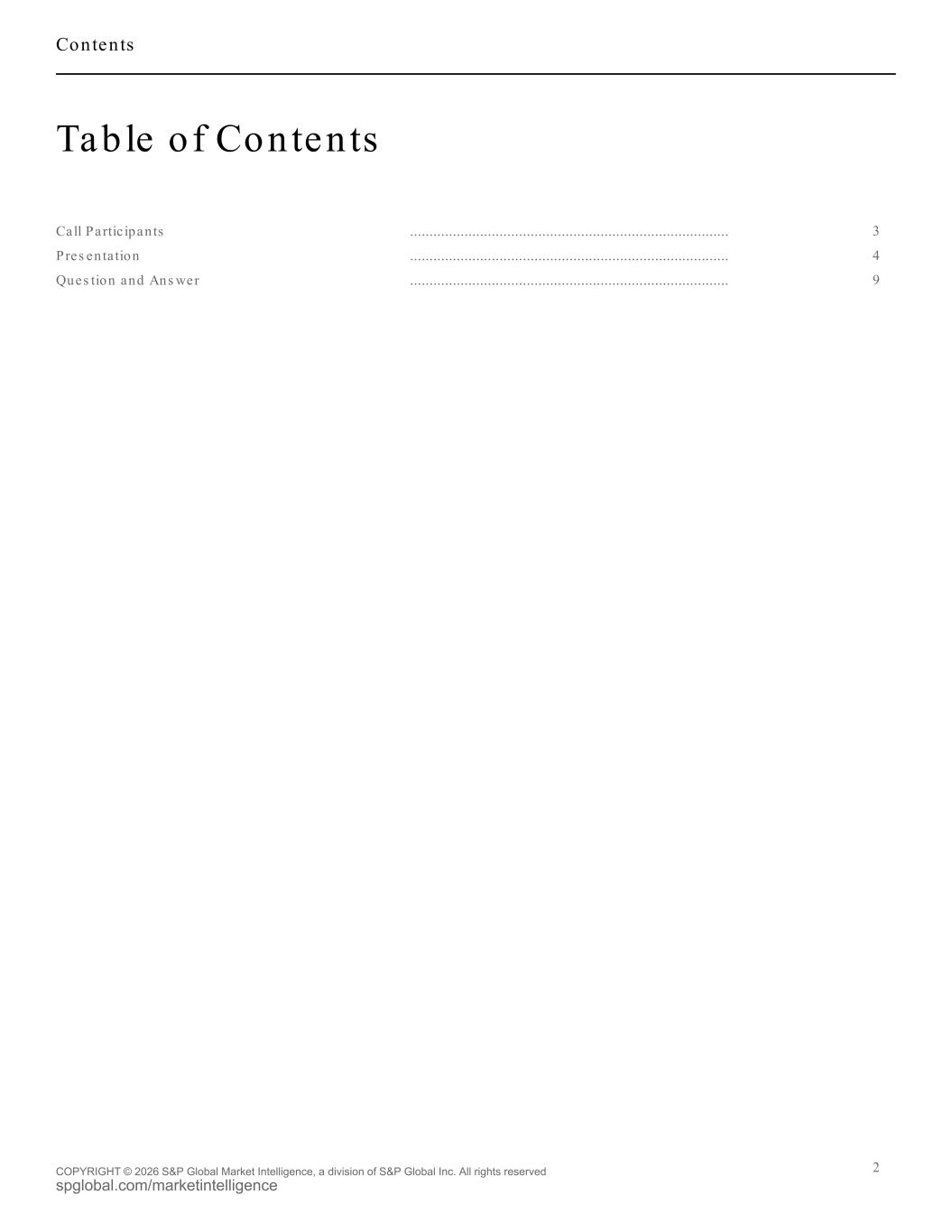 Contents Table of Conten ts Call Partic ipan ts .................................................................................. Pres en ta tion .................................................................................. Ques tion and Ans wer .................................................................................. 3 4 9 2COPYRIGHT spglobal.com/marketintelligence © 2026 S&P Global Market Intelligence, a division of S&P Global Inc. All rights reserved
