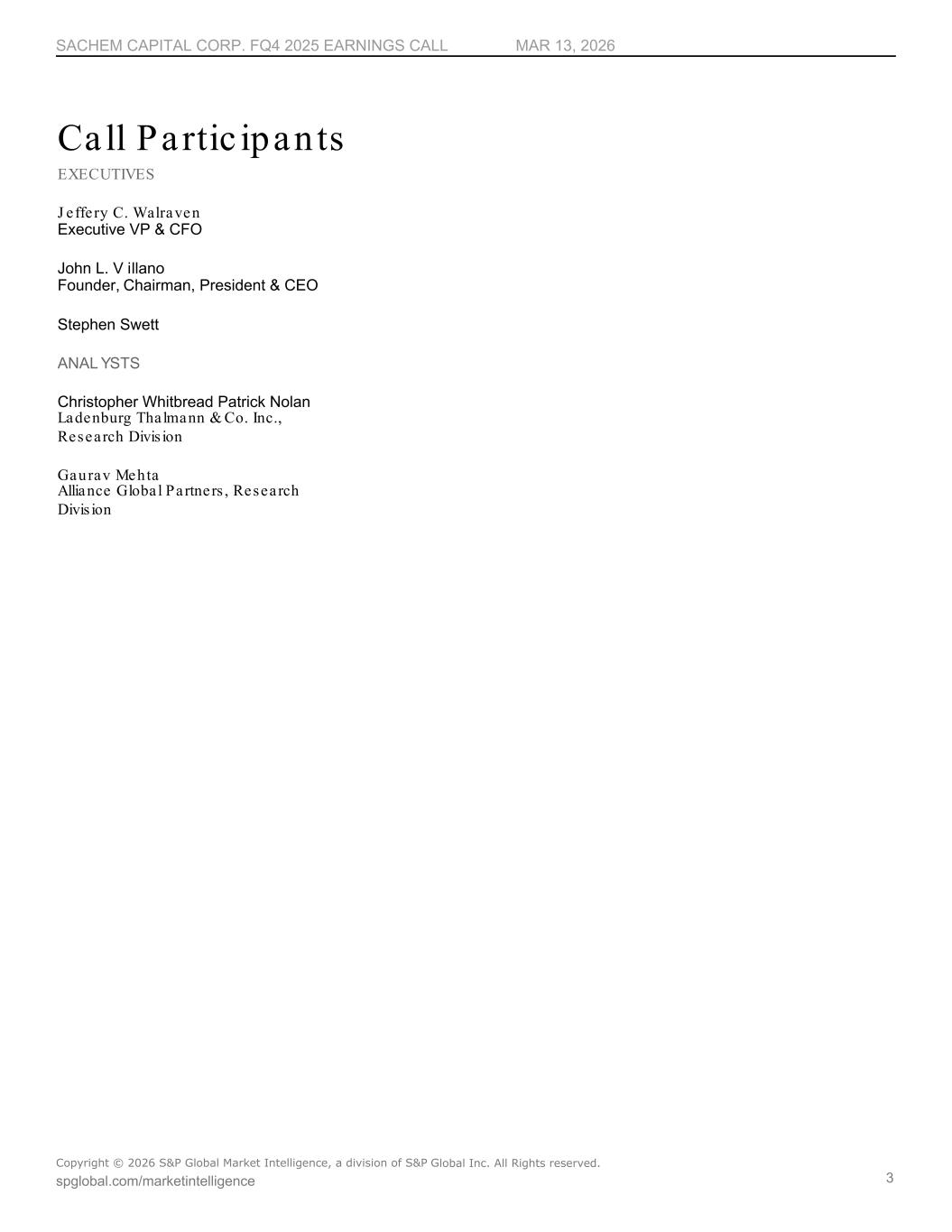 Call Partic ipants EXECUTIVES J effe ry C. Walraven Executive VP & CFO John L. V illano Founder, Chairman, President & CEO Stephen Swett ANAL YSTS Christopher Whitbread Patrick Nolan Ladenburg Tha lmann & Co. Inc., Research Divis ion Gaurav Mehta Alliance Globa l Partners , Research Divis ion Copyright © 2026 S&P Global Market Intelligence, a division of S&P spglobal.com/marketintelligence MAR 13, 2026 lobal Inc. All Rights reserved. 3 SACHEM CAPITAL CORP. FQ4 2025 EARNINGS CALL G
