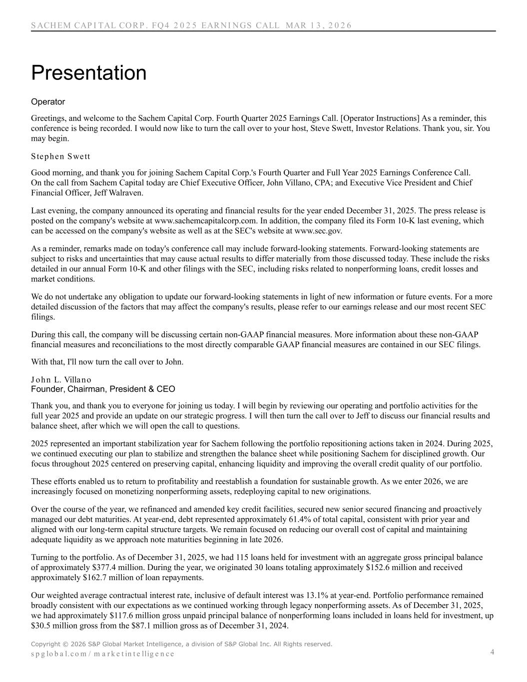 S ACHEM CAP I TAL CORP . FQ4 2 0 2 5 EARNI NGS CALL MAR 1 3 , 2 0 2 6 Presentation Operator Greetings, and welcome to the Sachem Capital Corp. Fourth Quarter 2025 Earnings Call. [Operator Instructions] As a reminder, this conference is being recorded. I would now like to turn the call over to your host, Steve Swett, Investor Relations. Thank you, sir. You may begin. S tephen Swett Good morning, and thank you for joining Sachem Capital Corp.'s Fourth Quarter and Full Year 2025 Earnings Conference Call. On the call from Sachem Capital today are Chief Executive Officer, John Villano, CPA; and Executive Vice President and Chief Financial Officer, Jeff Walraven. Last evening, the company announced its operating and financial results for the year ended December 31, 2025. The press release is posted on the company's website at www.sachemcapitalcorp.com. In addition, the company filed its Form 10-K last evening, which can be accessed on the company's website as well as at the SEC's website at www.sec.gov. As a reminder, remarks made on today's conference call may include forward-looking statements. Forward-looking statements are subject to risks and uncertainties that may cause actual results to differ materially from those discussed today. These include the risks detailed in our annual Form 10-K and other filings with the SEC, including risks related to nonperforming loans, credit losses and market conditions. We do not undertake any obligation to update our forward-looking statements in light of new information or future events. For a more detailed discussion of the factors that may affect the company's results, please refer to our earnings release and our most recent SEC filings. During this call, the company will be discussing certain non-GAAP financial measures. More information about these non-GAAP financial measures and reconciliations to the most directly comparable GAAP financial measures are contained in our SEC filings. With that, I'll now turn the call over to John. J ohn L. Villano Founder, Chairman, President & CEO Thank you, and thank you to everyone for joining us today. I will begin by reviewing our operating and portfolio activities for the full year 2025 and provide an update on our strategic progress. I will then turn the call over to Jeff to discuss our financial results and balance sheet, after which we will open the call to questions. 2025 represented an important stabilization year for Sachem following the portfolio repositioning actions taken in 2024. During 2025, we continued executing our plan to stabilize and strengthen the balance sheet while positioning Sachem for disciplined growth. Our focus throughout 2025 centered on preserving capital, enhancing liquidity and improving the overall credit quality of our portfolio. These efforts enabled us to return to profitability and reestablish a foundation for sustainable growth. As we enter 2026, we are increasingly focused on monetizing nonperforming assets, redeploying capital to new originations. Over the course of the year, we refinanced and amended key credit facilities, secured new senior secured financing and proactively managed our debt maturities. At year-end, debt represented approximately 61.4% of total capital, consistent with prior year and aligned with our long-term capital structure targets. We remain focused on reducing our overall cost of capital and maintaining adequate liquidity as we approach note maturities beginning in late 2026. Turning to the portfolio. As of December 31, 2025, we had 115 loans held for investment with an aggregate gross principal balance of approximately $377.4 million. During the year, we originated 30 loans totaling approximately $152.6 million and received approximately $162.7 million of loan repayments. Our weighted average contractual interest rate, inclusive of default interest was 13.1% at year-end. Portfolio performance remained broadly consistent with our expectations as we continued working through legacy nonperforming assets. As of December 31, 2025, we had approximately $117.6 million gross unpaid principal balance of nonperforming loans included in loans held for investment, up $30.5 million gross from the $87.1 million gross as of December 31, 2024. Copyright © 2026 S&P Global Market Intelligence, a division of S&P Global Inc. All Rights reserved. s p g lo b a l.c o m / m a r k e t in t e llig e n c e 4