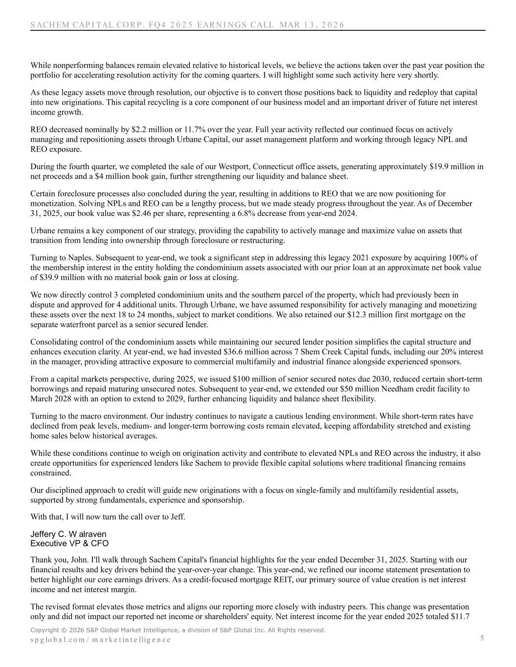 S ACHEM CAP I TAL CORP . FQ4 2 0 2 5 EARNI NGS CALL MAR 1 3 , 2 0 2 6 While nonperforming balances remain elevated relative to historical levels, we believe the actions taken over the past year position the portfolio for accelerating resolution activity for the coming quarters. I will highlight some such activity here very shortly. As these legacy assets move through resolution, our objective is to convert those positions back to liquidity and redeploy that capital into new originations. This capital recycling is a core component of our business model and an important driver of future net interest income growth. REO decreased nominally by $2.2 million or 11.7% over the year. Full year activity reflected our continued focus on actively managing and repositioning assets through Urbane Capital, our asset management platform and working through legacy NPL and REO exposure. During the fourth quarter, we completed the sale of our Westport, Connecticut office assets, generating approximately $19.9 million in net proceeds and a $4 million book gain, further strengthening our liquidity and balance sheet. Certain foreclosure processes also concluded during the year, resulting in additions to REO that we are now positioning for monetization. Solving NPLs and REO can be a lengthy process, but we made steady progress throughout the year. As of December 31, 2025, our book value was $2.46 per share, representing a 6.8% decrease from year-end 2024. Urbane remains a key component of our strategy, providing the capability to actively manage and maximize value on assets that transition from lending into ownership through foreclosure or restructuring. Turning to Naples. Subsequent to year-end, we took a significant step in addressing this legacy 2021 exposure by acquiring 100% of the membership interest in the entity holding the condominium assets associated with our prior loan at an approximate net book value of $39.9 million with no material book gain or loss at closing. We now directly control 3 completed condominium units and the southern parcel of the property, which had previously been in dispute and approved for 4 additional units. Through Urbane, we have assumed responsibility for actively managing and monetizing these assets over the next 18 to 24 months, subject to market conditions. We also retained our $12.3 million first mortgage on the separate waterfront parcel as a senior secured lender. Consolidating control of the condominium assets while maintaining our secured lender position simplifies the capital structure and enhances execution clarity. At year-end, we had invested $36.6 million across 7 Shem Creek Capital funds, including our 20% interest in the manager, providing attractive exposure to commercial multifamily and industrial finance alongside experienced sponsors. From a capital markets perspective, during 2025, we issued $100 million of senior secured notes due 2030, reduced certain short-term borrowings and repaid maturing unsecured notes. Subsequent to year-end, we extended our $50 million Needham credit facility to March 2028 with an option to extend to 2029, further enhancing liquidity and balance sheet flexibility. Turning to the macro environment. Our industry continues to navigate a cautious lending environment. While short-term rates have declined from peak levels, medium- and longer-term borrowing costs remain elevated, keeping affordability stretched and existing home sales below historical averages. While these conditions continue to weigh on origination activity and contribute to elevated NPLs and REO across the industry, it also create opportunities for experienced lenders like Sachem to provide flexible capital solutions where traditional financing remains constrained. Our disciplined approach to credit will guide new originations with a focus on single-family and multifamily residential assets, supported by strong fundamentals, experience and sponsorship. With that, I will now turn the call over to Jeff. Jeffery C. W alraven Executive VP & CFO Thank you, John. I'll walk through Sachem Capital's financial highlights for the year ended December 31, 2025. Starting with our financial results and key drivers behind the year-over-year change. This year-end, we refined our income statement presentation to better highlight our core earnings drivers. As a credit-focused mortgage REIT, our primary source of value creation is net interest income and net interest margin. The revised format elevates those metrics and aligns our reporting more closely with industry peers. This change was presentation only and did not impact our reported net income or shareholders' equity. Net interest income for the year ended 2025 totaled $11.7 Copyright © 2026 S&P Global Market Intelligence, a division of S&P Global Inc. All Rights reserved. s p g lo b a l.c o m / m a r k e t in t e llig e n c e 5