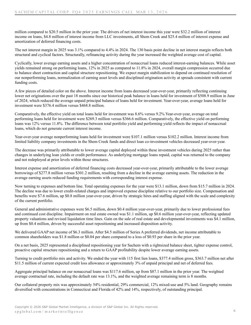 S ACHEM CAP I TAL CORP . FQ4 2 0 2 5 EARNI NGS CALL MAR 1 3 , 2 0 2 6 million compared to $20.5 million in the prior year. The drivers of net interest income this year were $32.2 million of interest income on loans, $4.8 million of interest income from LLC investments, all Shem Creek and $25.4 million of interest expense and amortization of deferred financing costs. The net interest margin in 2025 was 3.1% compared to 4.4% in 2024. The 130 basis point decline in net interest margin reflects both structural and cyclical factors. Structurally, refinancing activity during the year increased the weighted average cost of capital. Cyclically, lower average earning assets and a higher concentration of nonaccrual loans reduced interest-earning balances. While asset yields remained strong on performing loans, 12% in 2025 as compared to 11.8% in 2024, overall margin compression occurred due to balance sheet contraction and capital structure repositioning. We expect margin stabilization to depend on continued resolution of our nonperforming loans, normalization of earning asset levels and disciplined origination activity at spreads consistent with current funding costs. A few pieces of detailed color on the above. Interest income from loans decreased year-over-year, primarily reflecting continuing lower net originations over the past 18 months since our historical peak balance in loans held for investment of $508.9 million in June of 2024, which reduced the average unpaid principal balance of loans held for investment. Year-over-year, average loans held for investment were $376.4 million versus $468.8 million. Comparatively, the effective yield on total loans held for investment was 8.6% versus 9.2% Year-over-year, average on total performing loans held for investment were $269.3 million versus $366.6 million. Comparatively, the effective yield on performing loans was 12% versus 11.8%. The difference between total portfolio yield and performing yield reflects the impact of nonaccrual loans, which do not generate current interest income. Year-over-year average nonperforming loans held for investment were $107.1 million versus $102.2 million. Interest income from limited liability company investments in the Shem Creek funds and direct loan co-investment vehicles decreased year-over-year. The decrease was primarily attributable to lower average capital deployed within these investment vehicles during 2025 rather than changes in underlying loan yields or credit performance. As underlying mortgage loans repaid, capital was returned to the company and not redeployed at prior levels within those structures. Interest expense and amortization of deferred financing costs decreased year-over-year, primarily attributable to the lower average borrowings of $277.8 million versus $301.2 million, resulting from a decline in the average earning assets. The reduction in the average earning assets reduced funding requirements with corresponding interest expense. Now turning to expenses and bottom line. Total operating expenses for the year were $13.1 million, down from $15.7 million in 2024. The decline was due to lower credit-related charges and improved expense discipline relative to our portfolio size. Compensation and benefits were $7.6 million, up $0.8 million year-over-year, driven by strategic hires and staffing aligned with the scale and complexity of the current portfolio. General and administrative expenses were $6.5 million, down $0.4 million year-over-year, primarily due to lower professional fees and continued cost discipline. Impairment on real estate owned was $1.1 million, up $0.6 million year-over-year, reflecting updated property valuations and revised liquidation time lines. Gain on the sale of real estate and developmental investments was $4.1 million, up from $0.4 million, driven by successful asset repositioning and increased disposition activity. We delivered GAAP net income of $6.3 million. After $4.5 million of Series A preferred dividends, net income attributable to common shareholders was $1.8 million or $0.04 per share compared to a loss of $0.93 per share in the prior year. On a net basis, 2025 represented a disciplined repositioning year for Sachem with a rightsized balance sheet, tighter expense control, proactive capital structure repositioning and a return to GAAP profitability despite lower average earning assets. Turning to credit portfolio mix and activity. We ended the year with 115 first lien loans, $377.4 million gross, $363.7 million net after $11.5 million of current expected credit loss allowance or approximately 3% of unpaid principal and net of deferred fees. Aggregate principal balance on our nonaccrual loans was $117.6 million, up from $87.1 million in the prior year. The weighted average contractual rate, including the default rate was 13.1%, and the weighted average remaining term is 8 months. Our collateral property mix was approximately 54% residential, 29% commercial, 12% mixed-use and 5% land. Geography remains diversified with concentrations in Connecticut and Florida of 42% and 14%, respectively, of outstanding principal. Copyright © 2026 S&P Global Market Intelligence, a division of S&P Global Inc. All Rights reserved. s p g lo b a l.c o m / m a r k e t in t e llig e n c e 6
