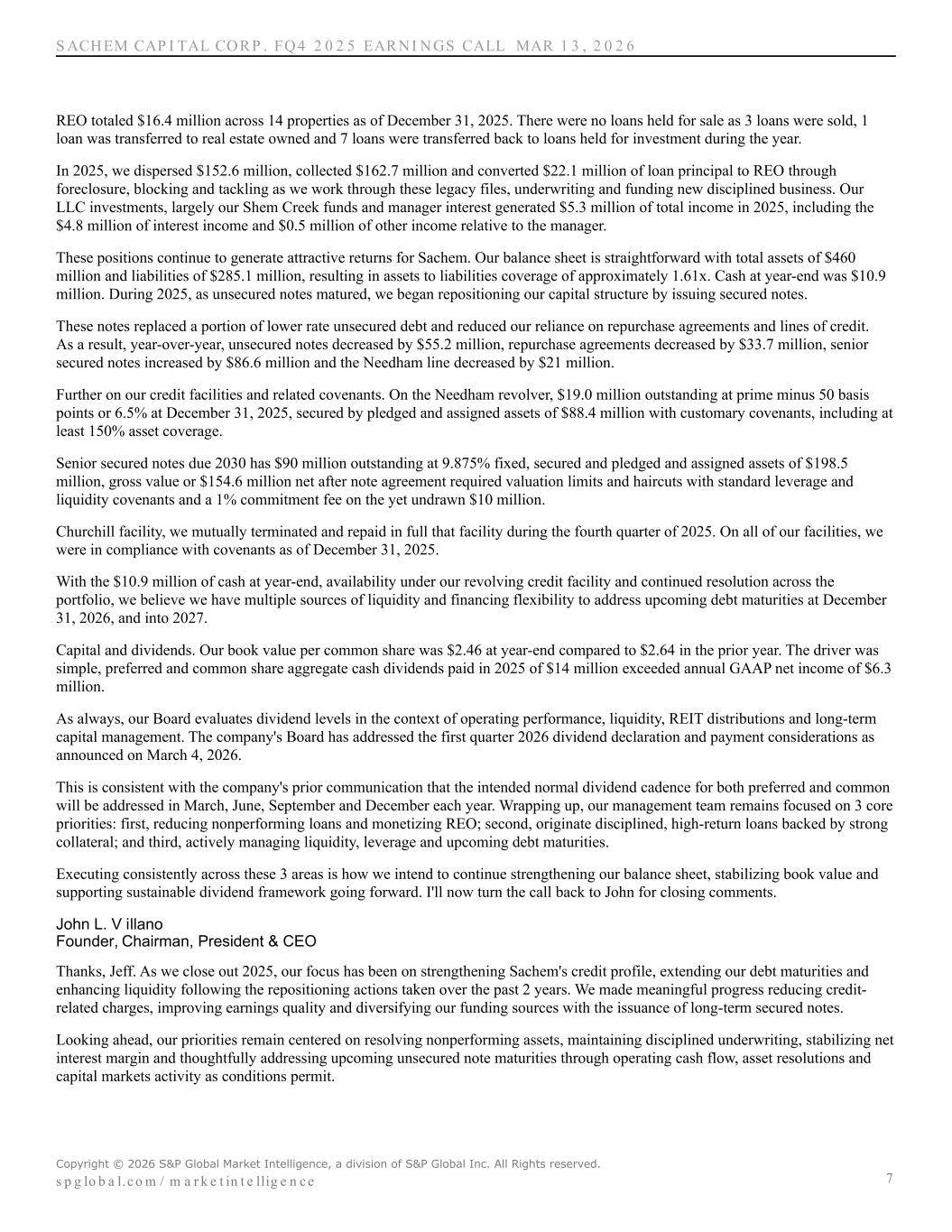 S ACHEM CAP I TAL CORP . FQ4 2 0 2 5 EARNI NGS CALL MAR 1 3 , 2 0 2 6 REO totaled $16.4 million across 14 properties as of December 31, 2025. There were no loans held for sale as 3 loans were sold, 1 loan was transferred to real estate owned and 7 loans were transferred back to loans held for investment during the year. In 2025, we dispersed $152.6 million, collected $162.7 million and converted $22.1 million of loan principal to REO through foreclosure, blocking and tackling as we work through these legacy files, underwriting and funding new disciplined business. Our LLC investments, largely our Shem Creek funds and manager interest generated $5.3 million of total income in 2025, including the $4.8 million of interest income and $0.5 million of other income relative to the manager. These positions continue to generate attractive returns for Sachem. Our balance sheet is straightforward with total assets of $460 million and liabilities of $285.1 million, resulting in assets to liabilities coverage of approximately 1.61x. Cash at year-end was $10.9 million. During 2025, as unsecured notes matured, we began repositioning our capital structure by issuing secured notes. These notes replaced a portion of lower rate unsecured debt and reduced our reliance on repurchase agreements and lines of credit. As a result, year-over-year, unsecured notes decreased by $55.2 million, repurchase agreements decreased by $33.7 million, senior secured notes increased by $86.6 million and the Needham line decreased by $21 million. Further on our credit facilities and related covenants. On the Needham revolver, $19.0 million outstanding at prime minus 50 basis points or 6.5% at December 31, 2025, secured by pledged and assigned assets of $88.4 million with customary covenants, including at least 150% asset coverage. Senior secured notes due 2030 has $90 million outstanding at 9.875% fixed, secured and pledged and assigned assets of $198.5 million, gross value or $154.6 million net after note agreement required valuation limits and haircuts with standard leverage and liquidity covenants and a 1% commitment fee on the yet undrawn $10 million. Churchill facility, we mutually terminated and repaid in full that facility during the fourth quarter of 2025. On all of our facilities, we were in compliance with covenants as of December 31, 2025. With the $10.9 million of cash at year-end, availability under our revolving credit facility and continued resolution across the portfolio, we believe we have multiple sources of liquidity and financing flexibility to address upcoming debt maturities at December 31, 2026, and into 2027. Capital and dividends. Our book value per common share was $2.46 at year-end compared to $2.64 in the prior year. The driver was simple, preferred and common share aggregate cash dividends paid in 2025 of $14 million exceeded annual GAAP net income of $6.3 million. As always, our Board evaluates dividend levels in the context of operating performance, liquidity, REIT distributions and long-term capital management. The company's Board has addressed the first quarter 2026 dividend declaration and payment considerations as announced on March 4, 2026. This is consistent with the company's prior communication that the intended normal dividend cadence for both preferred and common will be addressed in March, June, September and December each year. Wrapping up, our management team remains focused on 3 core priorities: first, reducing nonperforming loans and monetizing REO; second, originate disciplined, high-return loans backed by strong collateral; and third, actively managing liquidity, leverage and upcoming debt maturities. Executing consistently across these 3 areas is how we intend to continue strengthening our balance sheet, stabilizing book value and supporting sustainable dividend framework going forward. I'll now turn the call back to John for closing comments. John L. V illano Founder, Chairman, President & CEO Thanks, Jeff. As we close out 2025, our focus has been on strengthening Sachem's credit profile, extending our debt maturities and enhancing liquidity following the repositioning actions taken over the past 2 years. We made meaningful progress reducing credit- related charges, improving earnings quality and diversifying our funding sources with the issuance of long-term secured notes. Looking ahead, our priorities remain centered on resolving nonperforming assets, maintaining disciplined underwriting, stabilizing net interest margin and thoughtfully addressing upcoming unsecured note maturities through operating cash flow, asset resolutions and capital markets activity as conditions permit. Copyright © 2026 S&P Global Market Intelligence, a division of S&P Global Inc. All Rights reserved. s p g lo b a l.c o m / m a r k e t in t e llig e n c e 7