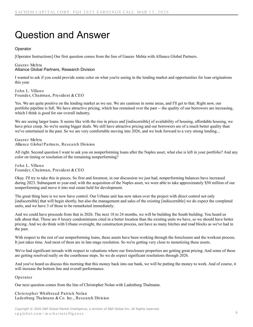 S ACHEM CAP I TAL CORP . FQ4 2 0 2 5 EARNI NGS CALL MAR 1 3 , 2 0 2 6 Question and Answer Operator [Operator Instructions] Our first question comes from the line of Gaurav Mehta with Alliance Global Partners. Gaurav Mehta Alliance Global Partners, Research Division I wanted to ask if you could provide some color on what you're seeing in the lending market and opportunities for loan originations this year. J ohn L. Villano Founder, Chairman, Pres ident & CEO Yes. We are quite positive on the lending market as we see. We are cautious in some areas, and I'll get to that. Right now, our portfolio pipeline is full. We have attractive pricing, which has remained over the past -- the quality of our borrowers are increasing, which I think is good for our overall industry. We are seeing larger loans. It seems like with the rise in prices and [indiscernible] of availability of housing, affordable housing, we have price creep. So we're seeing bigger deals. We still have attractive pricing and our borrowers are of a much better quality than we've entertained in the past. So we are very comfortable moving into 2026, and we look forward to a very strong lending... Gaurav Mehta Alliance Globa l Partners , Research Divis ion All right. Second question I want to ask you on nonperforming loans after the Naples asset, what else is left in your portfolio? And any color on timing or resolution of the remaining nonperforming? J ohn L. Villano Founder, Chairman, Pres ident & CEO Okay. I'll try to take this in pieces. So first and foremost, in our discussion we just had, nonperforming balances have increased during 2023. Subsequent to year-end, with the acquisition of the Naples asset, we were able to take approximately $50 million of our nonperforming and move it into real estate held for development. The great thing here is we now have control. Our Urbane unit has now taken over the project with direct control not only [indiscernible] that will begin shortly, but also the management and sales of the existing [indiscernible] we do expect the completed units, and we have 3 of those to be remarketed immediately. And we could have proceeds from that in 2026. The next 18 to 24 months, we will be building the South building. You heard us talk about that. Those are 4 luxury condominiums cited in a better location than the existing units we have, so we should have better pricing. And we do think with Urbane oversight, the construction process, not have as many hitches and road blocks as we've had in the past. With respect to the rest of our nonperforming loans, these assets have been working through the foreclosure and the workout process. It just takes time. And most of them are in late-stage resolution. So we're getting very close to monetizing these assets. We've had significant inroads with respect to valuations where our foreclosure properties are getting great pricing. And some of these are getting resolved really on the courthouse steps. So we do expect significant resolutions through 2026. And you've heard us discuss this morning that this money back into our bank, we will be putting the money to work. And of course, it will increase the bottom line and overall performance. Opera tor Our next question comes from the line of Christopher Nolan with Ladenburg Thalmann. Chris topher Whitbread Pa trick Nolan Ladenburg Tha lmann & Co. Inc., Research Divis ion Copyright © 2026 S&P Global Market Intelligence, a division of S&P Global Inc. All Rights reserved. s p g lo b a l.c o m / m a r k e t in t e llig e n c e 9