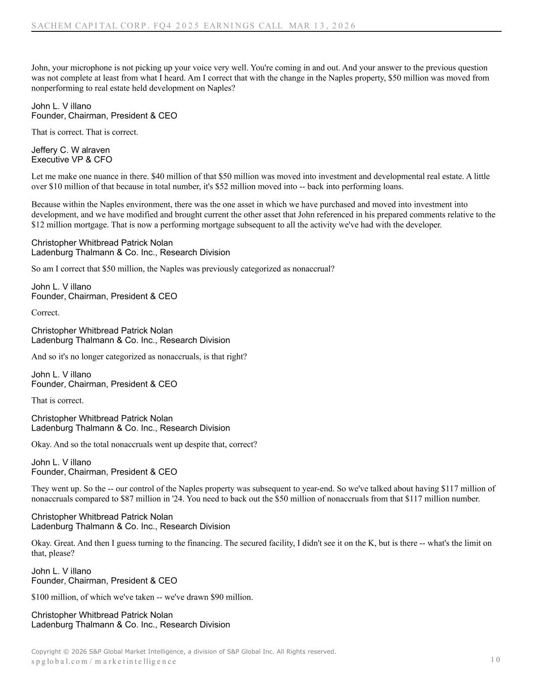S ACHEM CAP I TAL CORP . FQ4 2 0 2 5 EARNI NGS CALL MAR 1 3 , 2 0 2 6 John, your microphone is not picking up your voice very well. You're coming in and out. And your answer to the previous question was not complete at least from what I heard. Am I correct that with the change in the Naples property, $50 million was moved from nonperforming to real estate held development on Naples? John L. V illano Founder, Chairman, President & CEO That is correct. That is correct. Jeffery C. W alraven Executive VP & CFO Let me make one nuance in there. $40 million of that $50 million was moved into investment and developmental real estate. A little over $10 million of that because in total number, it's $52 million moved into -- back into performing loans. Because within the Naples environment, there was the one asset in which we have purchased and moved into investment into development, and we have modified and brought current the other asset that John referenced in his prepared comments relative to the $12 million mortgage. That is now a performing mortgage subsequent to all the activity we've had with the developer. Christopher Whitbread Patrick Nolan Ladenburg Thalmann & Co. Inc., Research Division So am I correct that $50 million, the Naples was previously categorized as nonaccrual? John L. V illano Founder, Chairman, President & CEO Correct. Christopher Whitbread Patrick Nolan Ladenburg Thalmann & Co. Inc., Research Division And so it's no longer categorized as nonaccruals, is that right? John L. V illano Founder, Chairman, President & CEO That is correct. Christopher Whitbread Patrick Nolan Ladenburg Thalmann & Co. Inc., Research Division Okay. And so the total nonaccruals went up despite that, correct? John L. V illano Founder, Chairman, President & CEO They went up. So the -- our control of the Naples property was subsequent to year-end. So we've talked about having $117 million of nonaccruals compared to $87 million in '24. You need to back out the $50 million of nonaccruals from that $117 million number. Christopher Whitbread Patrick Nolan Ladenburg Thalmann & Co. Inc., Research Division Okay. Great. And then I guess turning to the financing. The secured facility, I didn't see it on the K, but is there -- what's the limit on that, please? John L. V illano Founder, Chairman, President & CEO $100 million, of which we've taken -- we've drawn $90 million. Christopher Whitbread Patrick Nolan Ladenburg Thalmann & Co. Inc., Research Division Copyright © 2026 S&P Global Market Intelligence, a division of S&P Global Inc. All Rights reserved. s p g lo b a l.c o m / m a r k e t in t e llig e n c e 1 0