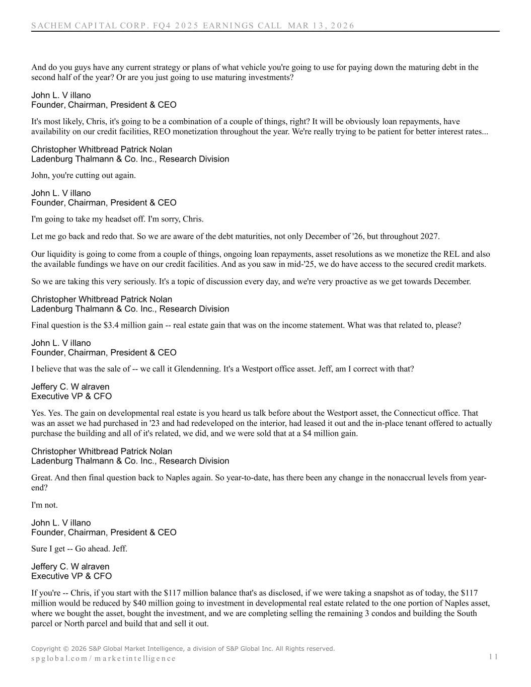 S ACHEM CAP I TAL CORP . FQ4 2 0 2 5 EARNI NGS CALL MAR 1 3 , 2 0 2 6 And do you guys have any current strategy or plans of what vehicle you're going to use for paying down the maturing debt in the second half of the year? Or are you just going to use maturing investments? John L. V illano Founder, Chairman, President & CEO It's most likely, Chris, it's going to be a combination of a couple of things, right? It will be obviously loan repayments, have availability on our credit facilities, REO monetization throughout the year. We're really trying to be patient for better interest rates... Christopher Whitbread Patrick Nolan Ladenburg Thalmann & Co. Inc., Research Division John, you're cutting out again. John L. V illano Founder, Chairman, President & CEO I'm going to take my headset off. I'm sorry, Chris. Let me go back and redo that. So we are aware of the debt maturities, not only December of '26, but throughout 2027. Our liquidity is going to come from a couple of things, ongoing loan repayments, asset resolutions as we monetize the REL and also the available fundings we have on our credit facilities. And as you saw in mid-'25, we do have access to the secured credit markets. So we are taking this very seriously. It's a topic of discussion every day, and we're very proactive as we get towards December. Christopher Whitbread Patrick Nolan Ladenburg Thalmann & Co. Inc., Research Division Final question is the $3.4 million gain -- real estate gain that was on the income statement. What was that related to, please? John L. V illano Founder, Chairman, President & CEO I believe that was the sale of -- we call it Glendenning. It's a Westport office asset. Jeff, am I correct with that? Jeffery C. W alraven Executive VP & CFO Yes. Yes. The gain on developmental real estate is you heard us talk before about the Westport asset, the Connecticut office. That was an asset we had purchased in '23 and had redeveloped on the interior, had leased it out and the in-place tenant offered to actually purchase the building and all of it's related, we did, and we were sold that at a $4 million gain. Christopher Whitbread Patrick Nolan Ladenburg Thalmann & Co. Inc., Research Division Great. And then final question back to Naples again. So year-to-date, has there been any change in the nonaccrual levels from year- end? I'm not. John L. V illano Founder, Chairman, President & CEO Sure I get -- Go ahead. Jeff. Jeffery C. W alraven Executive VP & CFO If you're -- Chris, if you start with the $117 million balance that's as disclosed, if we were taking a snapshot as of today, the $117 million would be reduced by $40 million going to investment in developmental real estate related to the one portion of Naples asset, where we bought the asset, bought the investment, and we are completing selling the remaining 3 condos and building the South parcel or North parcel and build that and sell it out. Copyright © 2026 S&P Global Market Intelligence, a division of S&P Global Inc. All Rights reserved. s p g lo b a l.c o m / m a r k e t in t e llig e n c e 1 1