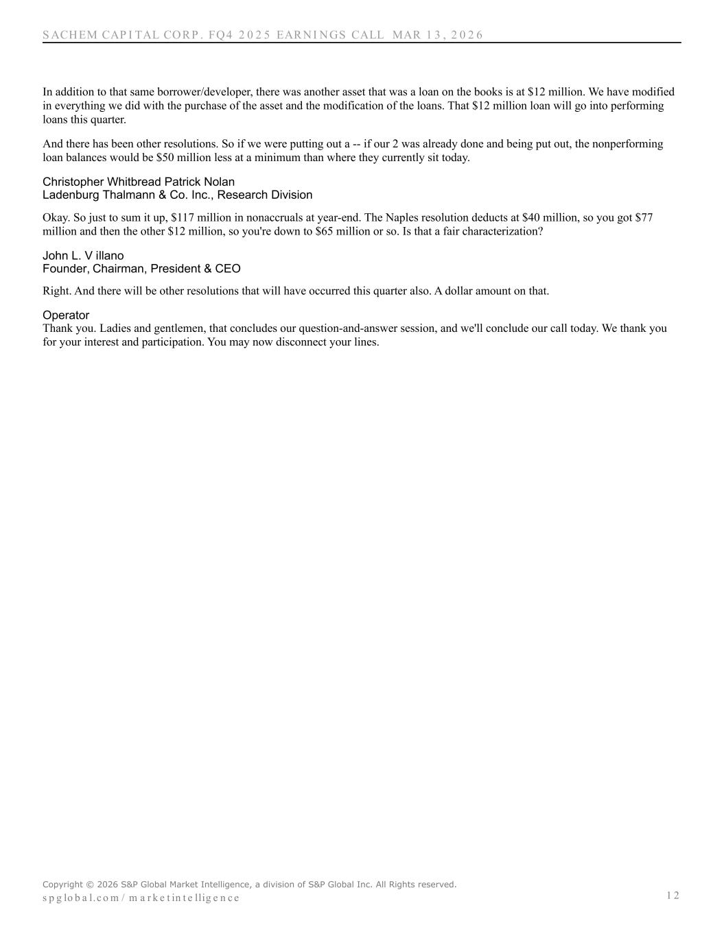 S ACHEM CAP I TAL CORP . FQ4 2 0 2 5 EARNI NGS CALL MAR 1 3 , 2 0 2 6 In addition to that same borrower/developer, there was another asset that was a loan on the books is at $12 million. We have modified in everything we did with the purchase of the asset and the modification of the loans. That $12 million loan will go into performing loans this quarter. And there has been other resolutions. So if we were putting out a -- if our 2 was already done and being put out, the nonperforming loan balances would be $50 million less at a minimum than where they currently sit today. Christopher Whitbread Patrick Nolan Ladenburg Thalmann & Co. Inc., Research Division Okay. So just to sum it up, $117 million in nonaccruals at year-end. The Naples resolution deducts at $40 million, so you got $77 million and then the other $12 million, so you're down to $65 million or so. Is that a fair characterization? John L. V illano Founder, Chairman, President & CEO Right. And there will be other resolutions that will have occurred this quarter also. A dollar amount on that. Operator Thank you. Ladies and gentlemen, that concludes our question-and-answer session, and we'll conclude our call today. We thank you for your interest and participation. You may now disconnect your lines. Copyright © 2026 S&P Global Market Intelligence, a division of S&P Global Inc. All Rights reserved. s p g lo b a l.c o m / m a r k e t in t e llig e n c e 1 2