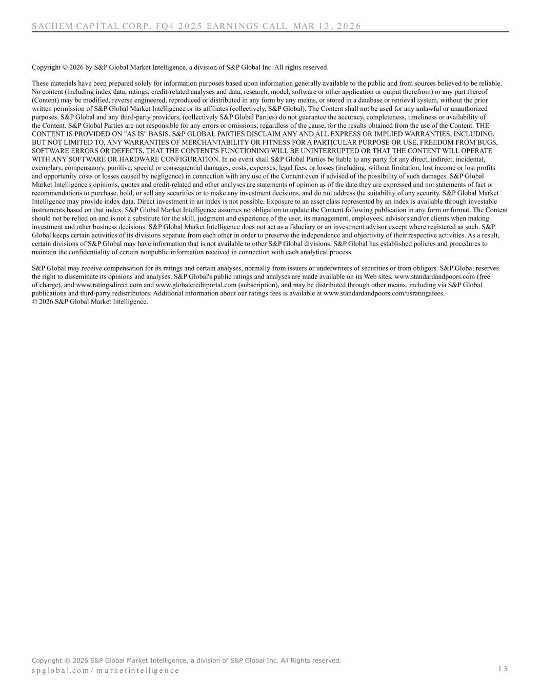 S ACHEM CAP I TAL CORP . FQ4 2 0 2 5 EARNI NGS CALL MAR 1 3 , 2 0 2 6 Copyright © 2026 by S&P Global Market Intelligence, a division of S&P Global Inc. All rights reserved. These materials have been prepared solely for information purposes based upon information generally available to the public and from sources believed to be reliable. No content (including index data, ratings, credit-related analyses and data, research, model, software or other application or output therefrom) or any part thereof (Content) may be modified, reverse engineered, reproduced or distributed in any form by any means, or stored in a database or retrieval system, without the prior written permission of S&P Global Market Intelligence or its affiliates (collectively, S&P Global). The Content shall not be used for any unlawful or unauthorized purposes. S&P Global and any third-party providers, (collectively S&P Global Parties) do not guarantee the accuracy, completeness, timeliness or availability of the Content. S&P Global Parties are not responsible for any errors or omissions, regardless of the cause, for the results obtained from the use of the Content. THE CONTENT IS PROVIDED ON "AS IS" BASIS. S&P GLOBAL PARTIES DISCLAIM ANY AND ALL EXPRESS OR IMPLIED WARRANTIES, INCLUDING, BUT NOT LIMITED TO, ANY WARRANTIES OF MERCHANTABILITY OR FITNESS FOR A PARTICULAR PURPOSE OR USE, FREEDOM FROM BUGS, SOFTWARE ERRORS OR DEFECTS, THAT THE CONTENT'S FUNCTIONING WILL BE UNINTERRUPTED OR THAT THE CONTENT WILL OPERATE WITH ANY SOFTWARE OR HARDWARE CONFIGURATION. In no event shall S&P Global Parties be liable to any party for any direct, indirect, incidental, exemplary, compensatory, punitive, special or consequential damages, costs, expenses, legal fees, or losses (including, without limitation, lost income or lost profits and opportunity costs or losses caused by negligence) in connection with any use of the Content even if advised of the possibility of such damages. S&P Global Market Intelligence's opinions, quotes and credit-related and other analyses are statements of opinion as of the date they are expressed and not statements of fact or recommendations to purchase, hold, or sell any securities or to make any investment decisions, and do not address the suitability of any security. S&P Global Market Intelligence may provide index data. Direct investment in an index is not possible. Exposure to an asset class represented by an index is available through investable instruments based on that index. S&P Global Market Intelligence assumes no obligation to update the Content following publication in any form or format. The Content should not be relied on and is not a substitute for the skill, judgment and experience of the user, its management, employees, advisors and/or clients when making investment and other business decisions. S&P Global Market Intelligence does not act as a fiduciary or an investment advisor except where registered as such. S&P Global keeps certain activities of its divisions separate from each other in order to preserve the independence and objectivity of their respective activities. As a result, certain divisions of S&P Global may have information that is not available to other S&P Global divisions. S&P Global has established policies and procedures to maintain the confidentiality of certain nonpublic information received in connection with each analytical process. S&P Global may receive compensation for its ratings and certain analyses, normally from issuers or underwriters of securities or from obligors. S&P Global reserves the right to disseminate its opinions and analyses. S&P Global's public ratings and analyses are made available on its Web sites, www.standardandpoors.com (free of charge), and www.ratingsdirect.com and www.globalcreditportal.com (subscription), and may be distributed through other means, including via S&P Global publications and third-party redistributors. Additional information about our ratings fees is available at www.standardandpoors.com/usratingsfees. © 2026 S&P Global Market Intelligence. Copyright © 2026 S&P Global Market Intelligence, a division of S&P Global Inc. All Rights reserved. s p g lo b a l.c o m / m a r k e t in t e llig e n c e 1 3