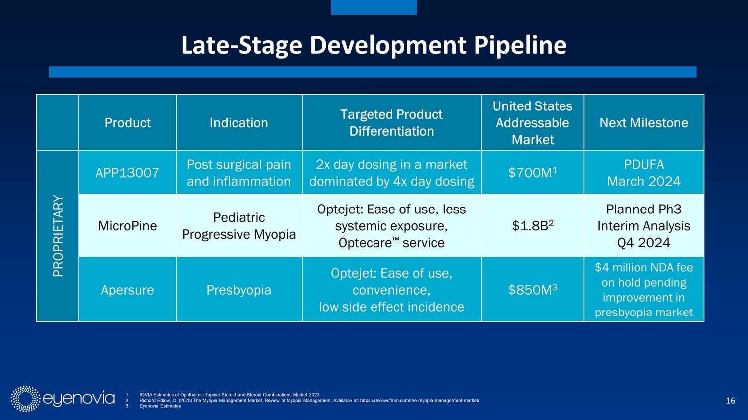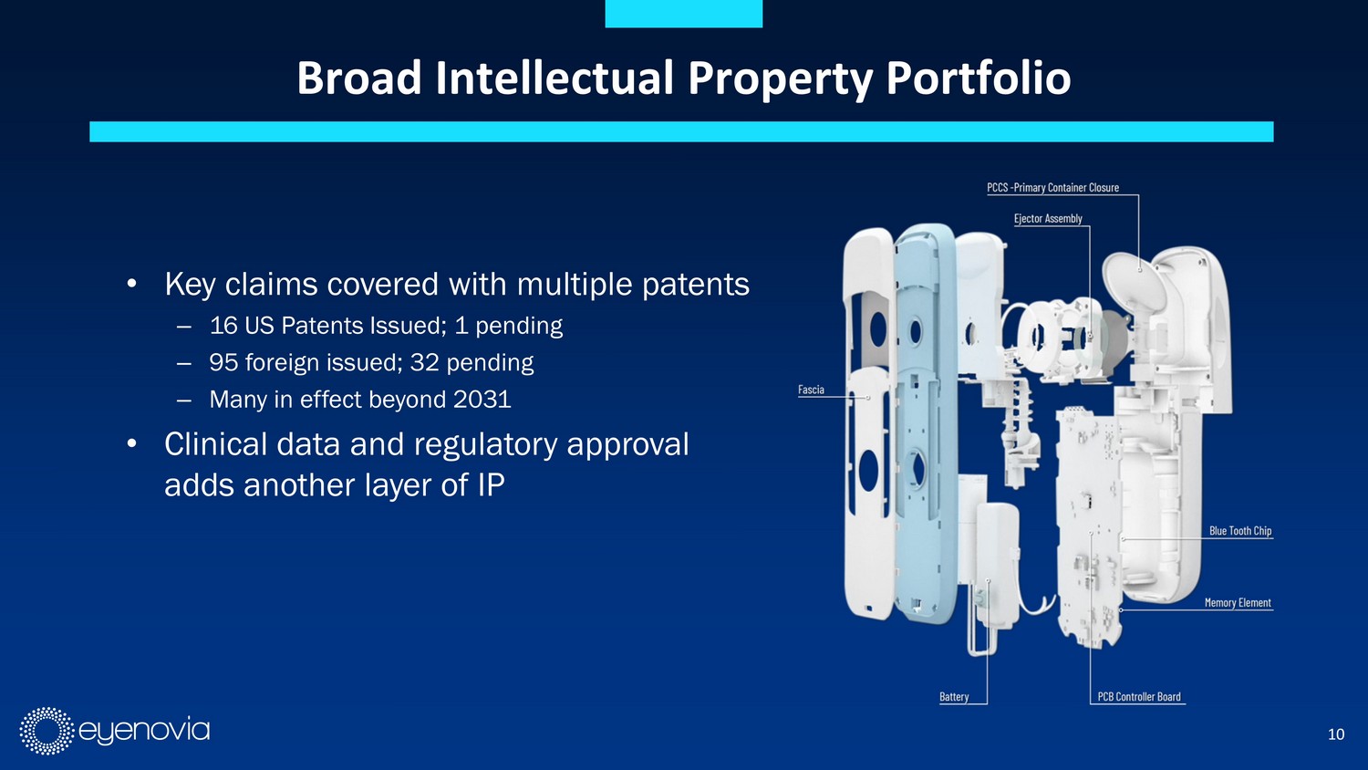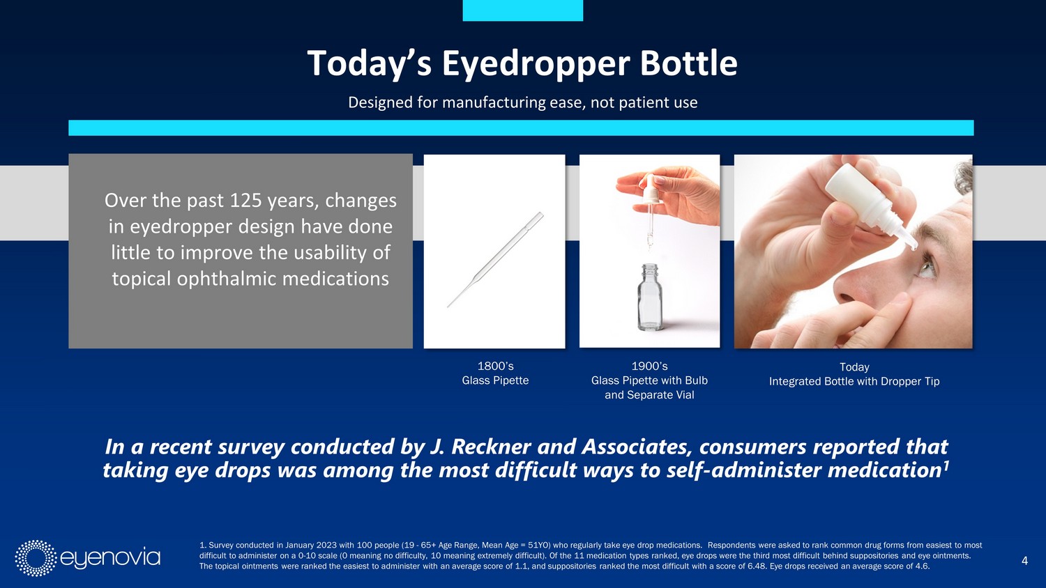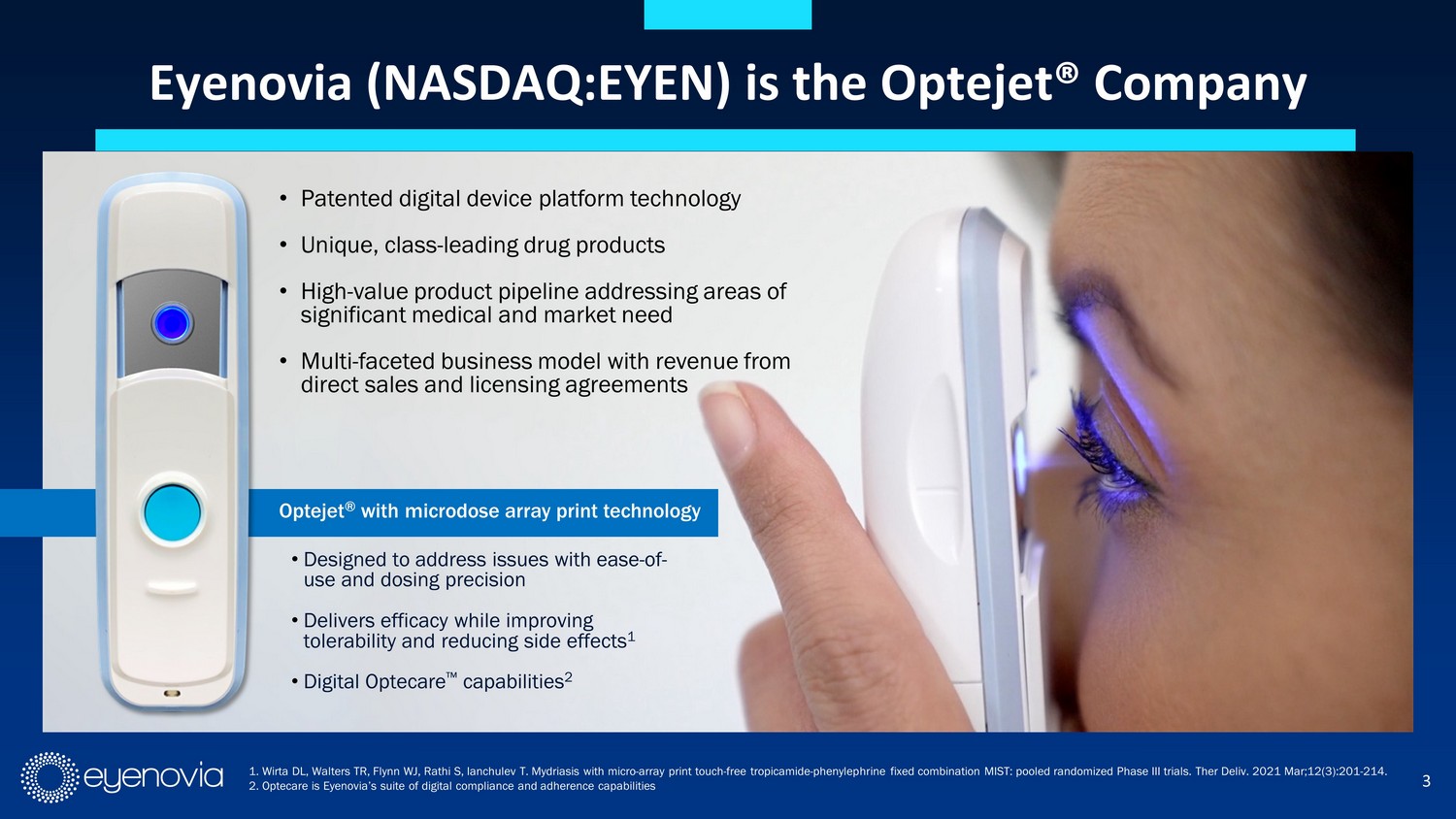 Forward - looking Statements Except for historical information, all the statements, expectations and assumptions contained in this presentation are forwar d - l ooking statements. Forward - looking statements include, but are not limited to, statements that express our intentions, beliefs, expecta tions, strategies, predictions or any other statements relating to our future activities or other future events or conditions, inclu din g estimated market opportunities for our product candidates and platform technology. These statements are based on current expectations, est imates and projections about our business based, in part, on assumptions made by management. These statements are not guarantees of fut ure performance and involve risks, uncertainties and assumptions that are difficult to predict. Therefore, actual outcomes and re sul ts may, and in some cases are likely to, differ materially from what is expressed or forecasted in the forward - looking statements due to num erous factors discussed from time to time in documents which we file with the U.S. Securities and Exchange Commission. In addition, such statements could be affected by risks and uncertainties related to, among other things: risks of our clinic al trials, including, but not limited to, the costs, design, initiation and enrollment, timing, progress and results of such trials; the timing of, an d our ability to submit applications for, obtaining and maintaining regulatory approvals for our product candidates; the potential advantages of our product candidates and platform technology and the potential for approval of APP13007 ; the rate and degree of market acceptance and clinical utility of our product candidates; our estimates regarding the potential market opportunity for our product candidates; relia nce on third parties to develop and commercialize our product candidates; the risk of defects in, or returns of, our products; the ability of us and our partners to timely develop, implement and maintain manufacturing, commercialization and marketing capabilities and strategies fo r our product candidates; intellectual property risks; changes in legal, regulatory, legislative and geopolitical environments in t he markets in which we operate and the impact of these changes on our ability to obtain regulatory approval for our products; and our competitive po sition. Any forward - looking statements speak only as of the date on which they are made, and except as may be required under applicable securities laws, Eyenovia does not undertake any obligation to update any forward - looking statements. 2