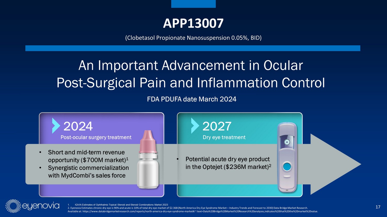 16 Late - Stage Development Pipeline 1. IQVIA Estimates of Ophthalmic Topical Steroid and Steroid Combinations Market 2023 2. Richard Edlow , O. (2020) The Myopia Management Market, Review of Myopia Management. Available at: https://reviewofmm.com/the - myopia - managemen t - market/ 3. Eyenovia Estimates Product Indication Targeted Product Differentiation United States Addressable Market Next Milestone PROPRIETARY APP13007 Post surgical pain and inflammation 2x day dosing in a market dominated by 4x day dosing $700M 1 PDUFA March 2024 MicroPine Pediatric Progressive Myopia Optejet: Ease of use, less systemic exposure, Optecare Œ service $1.8B 2 Planned Ph3 Interim Analysis Q4 2024 Apersure Presbyopia Optejet: Ease of use, convenience, low side effect incidence $850M 3 $4 million NDA fee on hold pending improvement in presbyopia market