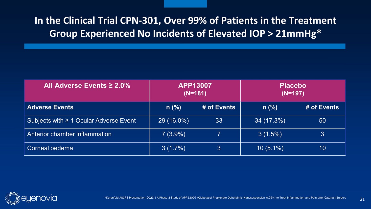 20 When it Comes to Post - Surgical Pain and Inflammation Management Efficacy and Twice - a - Day Dosing Matter Most 1. J. Reckner and Associates survey conducted August 2023 with 100 Ophthalmologists performing at least 10 ocular surgeries p er week. Respondents were asked to consider the description of the product mentioned with the following description: “There is a new corticosteroid that may be available next year. This new steroid would be dosed twice - dai ly post - ocular surgery by patients. In clinical trials, it has shown to be very effective in reducing inflammation and pain and well tolerated with a low (<2%) incidence of IOP spikes over a 14 - day usage period.” What part of this description is most important to you? Preferred posology for post - cataract surgery: Antibiotic, NSAID and steroid once in the morning and evening 1 Post - Surgical Steroid Posology Dexamethasone 4x daily Difluprednate 4x daily Flurometholone 4x daily Loteprednol 2x - 4x daily Prednisolone 2x - 4x daily APP13007 2x daily https://pi.bausch.com/globalassets/pdf/PackageInserts/Pharma/Rx - Generics/Dexamethasone - Sodium - Phosphate - A - 9100202 - 9100302.pdf https:// www.accessdata.fda.gov / drugsatfda_docs /label/2008/022212lbl.pdf https:// www.accessdata.fda.gov / drugsatfda_docs /label/2013/016851s063lbl.pdf https:// www.accessdata.fda.gov / drugsatfda_docs /label/2012/202872lbl.pdf https:// www.accessdata.fda.gov / drugsatfda_docs /label/2017/017011s047lbl.pdf