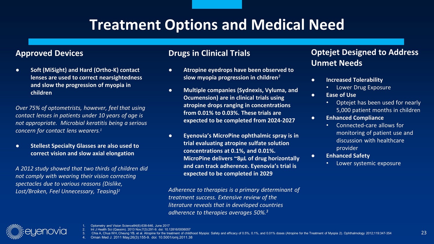 23 Treatment Options and Medical Need Drugs in Clinical Trials ● Atropine eyedrops have been observed to slow myopia progression in children 3 ● Multiple companies (Sydnexis, Vyluma, and Ocumension) are in clinical trials using atropine drops ranging in concentrations from 0.01% to 0.03%. These trials are expected to be completed from 2024 - 2027 ● Eyenovia’s MicroPine ophthalmic spray is in trial evaluating atropine sulfate solution concentrations at 0.1%, and 0.01%. MicroPine delivers ~8µL of drug horizontally and can track adherence. Eyenovia’s trial is expected to be completed in 2029 Adherence to therapies is a primary determinant of treatment success. Extensive review of the literature reveals that in developed countries adherence to therapies averages 50%. 3 Optejet Designed to Address Unmet Needs ● Increased Tolerability • Lower Drug Exposure ● Ease of Use • Optejet has been used for nearly 5,000 patient months in children ● Enhanced Compliance • Connected - care allows for monitoring of patient use and discussion with healthcare provider ● Enhanced Safety • Lower systemic exposure 1. Optometry and Vision Science94(6):638 - 646, June 2017 2. Int J Health Sci (Qassim). 2013 Nov;7(3):291 - 9. doi : 10.12816/0006057 3. Chia A, Chua WH, Cheung YB, et al. Atropine for the treatment of childhood Myopia: Safety and efficacy of 0.5%, 0.1%, and 0.0 1% doses (Atropine for the Treatment of Myopia 2). Ophthalmology 2012;119:347 - 354 4. Oman Med J. 2011 May;26(3):155 - 9. doi : 10.5001/omj.2011.38 Approved Devices ● Soft ( MiSight ) and Hard (Ortho - K) contact lenses are used to correct nearsightedness and slow the progression of myopia in children Over 75% of optometrists, however, feel that using contact lenses in patients under 10 years of age is not appropriate. Microbial keratitis being a serious concern for contact lens wearers . 1 ● Stellest Specialty Glasses are also used to correct vision and slow axial elongation A 2012 study showed that two thirds of children did not comply with wearing their vision correcting spectacles due to various reasons (Dislike, Lost/Broken, Feel Unnecessary, Teasing) 2