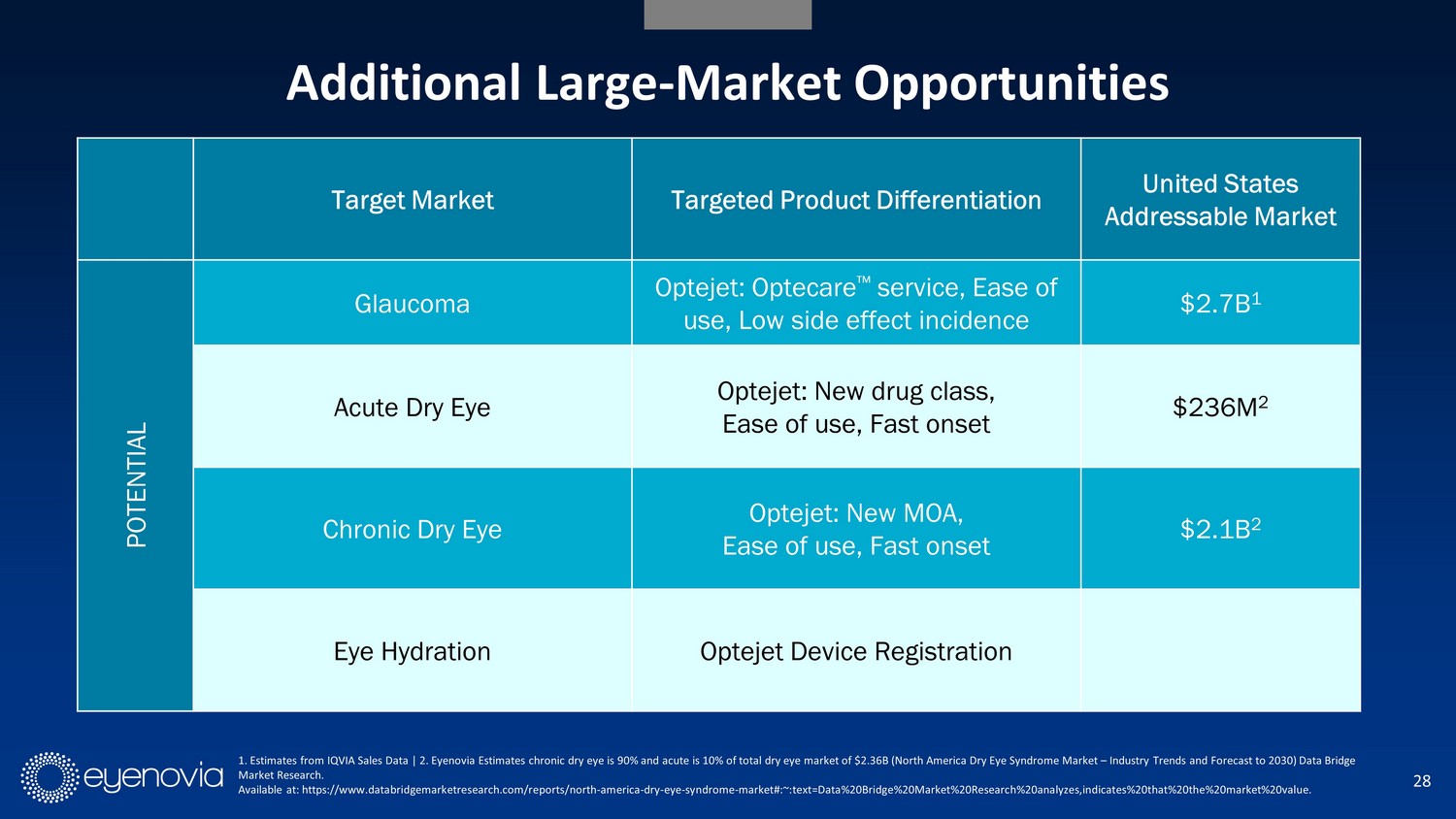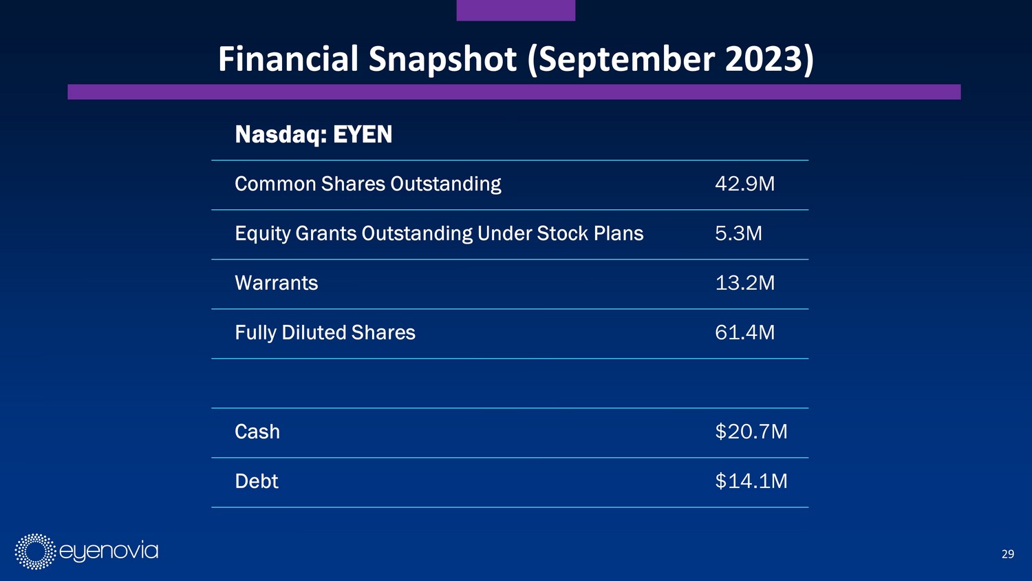 27 Eyenovia: 2024 Key Events Q1 National MydCombi Launch APP13007 PDUFA Early March Q2 Q3 Q4 MydCombi Œ Post - Marketing Study Results MydCombi Œ Gen - 2 Planned FDA Meeting National APP13007 Launch (Pending Approval) MicroPine Planned FDA Meeting