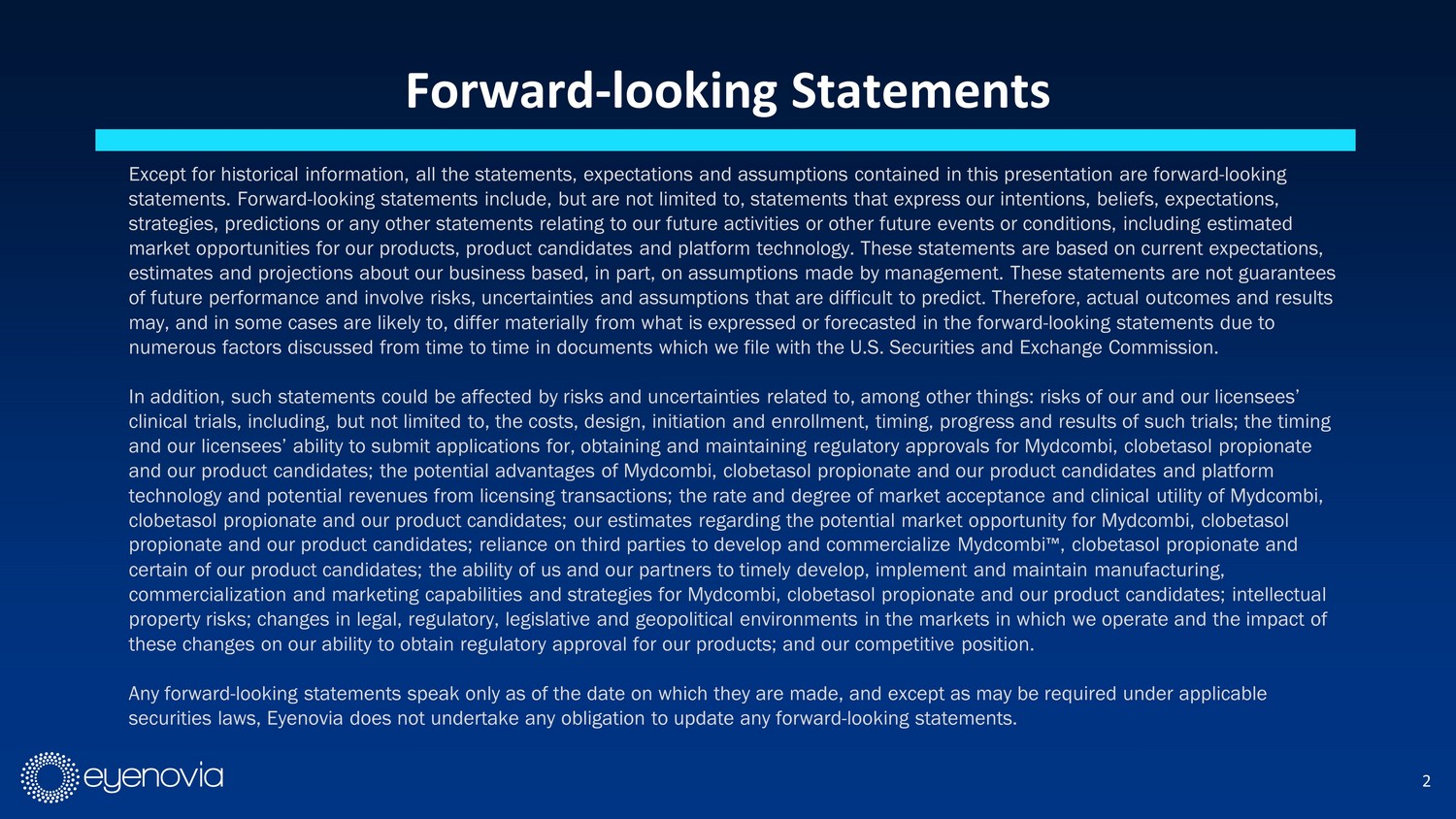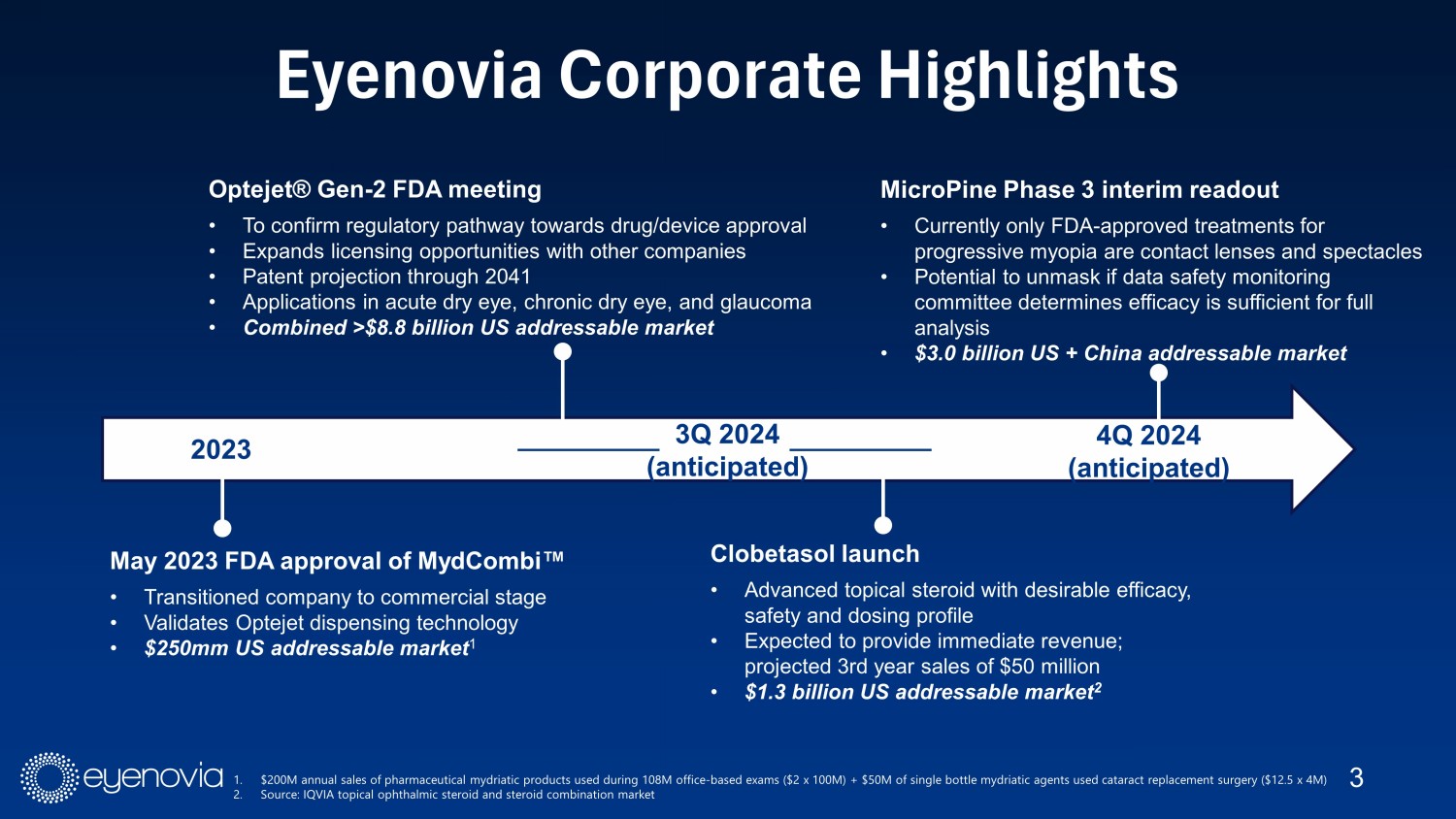 Forward - looking Statements Except for historical information, all the statements, expectations and assumptions contained in this presentation are forwar d - l ooking statements. Forward - looking statements include, but are not limited to, statements that express our intentions, beliefs, expecta tions, strategies, predictions or any other statements relating to our future activities or other future events or conditions, inclu din g estimated market opportunities for our products, product candidates and platform technology. These statements are based on current expe cta tions, estimates and projections about our business based, in part, on assumptions made by management. These statements are not guar ant ees of future performance and involve risks, uncertainties and assumptions that are difficult to predict. Therefore, actual outco mes and results may, and in some cases are likely to, differ materially from what is expressed or forecasted in the forward - looking statements d ue to numerous factors discussed from time to time in documents which we file with the U.S. Securities and Exchange Commission. In addition, such statements could be affected by risks and uncertainties related to, among other things: risks of our and ou r l icenses’ clinical trials, including, but not limited to, the costs, design, initiation and enrollment, timing, progress and results of su ch trials; the timing and our licensees’ ability to submit applications for, obtaining and maintaining regulatory approvals for Mydcombi, clobetaso l p ropionate and our product candidates; the potential advantages of Mydcombi, clobetasol propionate and our product candidates and platform technology and potential revenues from licensing transactions; the rate and degree of market acceptance and clinical utility of Mydcombi, clobetasol propionate and our product candidates; our estimates regarding the potential market opportunity for Mydcombi, clob eta sol propionate and our product candidates; reliance on third parties to develop and commercialize Mydcombi Ρ , clobetasol propionate and certain of our product candidates; the ability of us and our partners to timely develop, implement and maintain manufacturing, commercialization and marketing capabilities and strategies for Mydcombi, clobetasol propionate and our product candidates; i nte llectual property risks; changes in legal, regulatory, legislative and geopolitical environments in the markets in which we operate an d t he impact of these changes on our ability to obtain regulatory approval for our products; and our competitive position. Any forward - looking statements speak only as of the date on which they are made, and except as may be required under applicable securities laws, Eyenovia does not undertake any obligation to update any forward - looking statements. 2