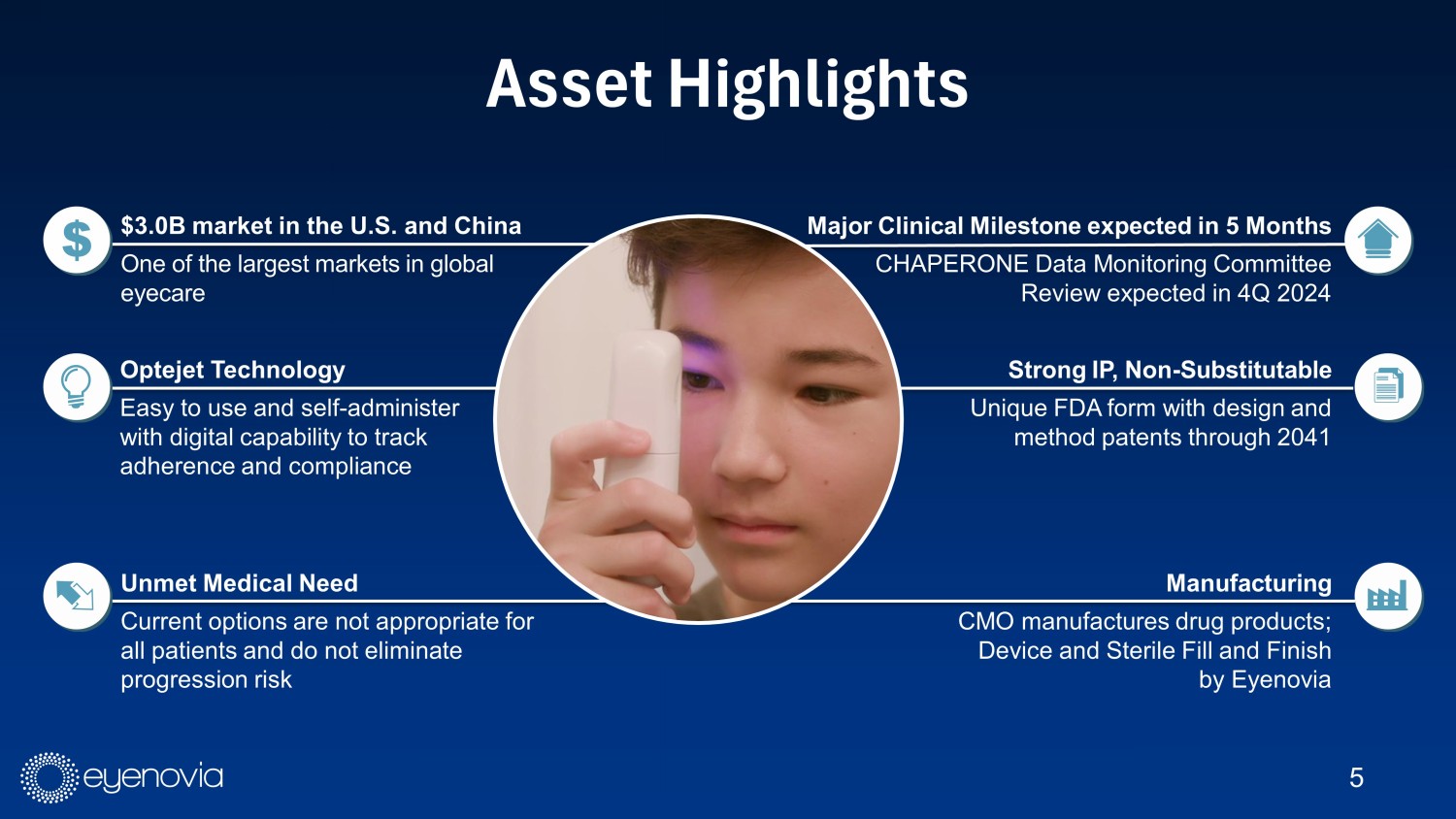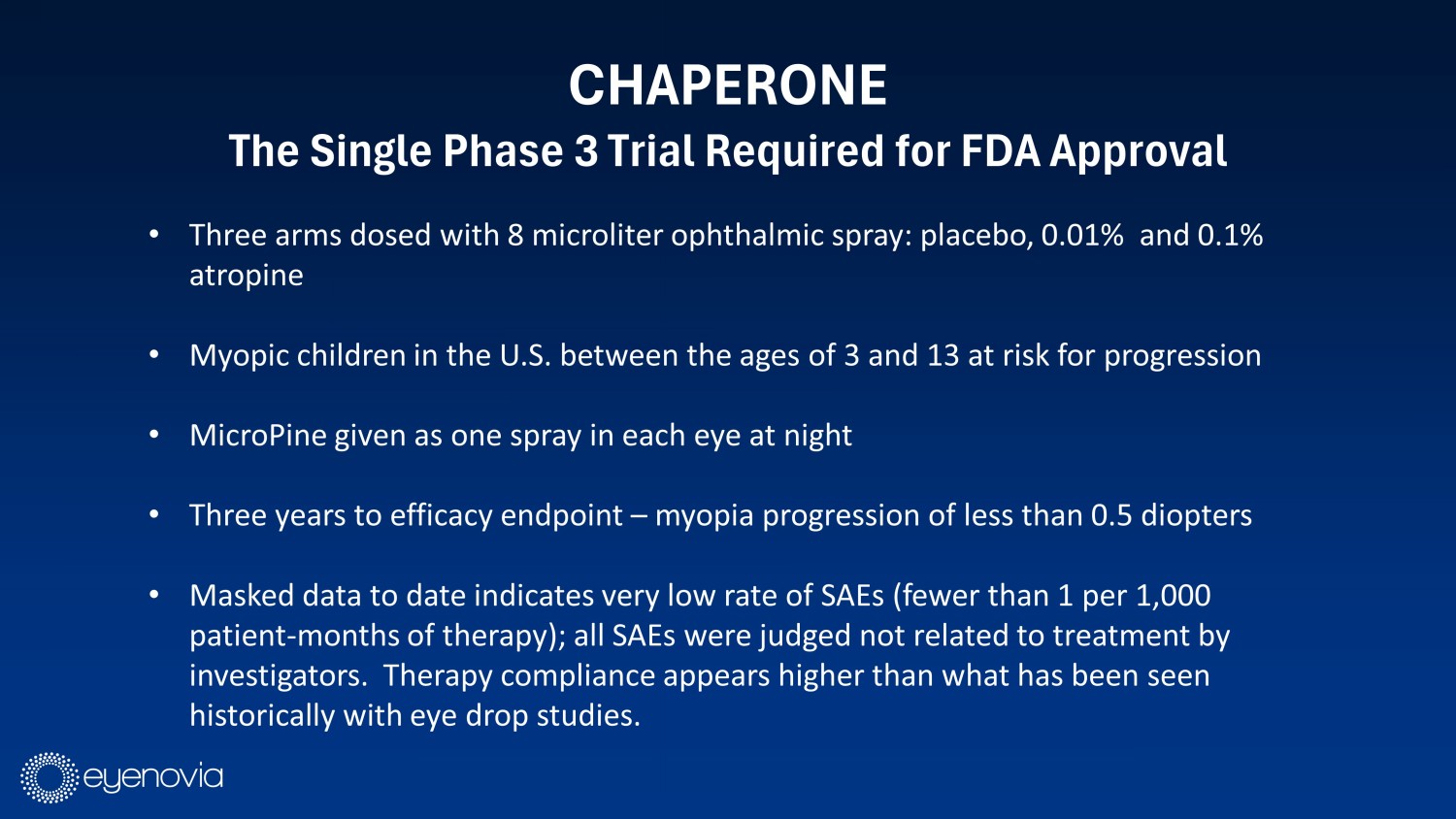 CHAPERONE The Single Phase 3 Trial Required for FDA Approval • Three arms dosed with 8 microliter ophthalmic spray: placebo, 0.01% and 0.1% atropine • Myopic children in the U.S. between the ages of 3 and 13 at risk for progression • MicroPine given as one spray in each eye at night • Three years to efficacy endpoint – myopia progression of less than 0.5 diopters • Masked data to date indicates very low rate of SAEs (fewer than 1 per 1,000 patient - months of therapy); all SAEs were judged not related to treatment by investigators. Therapy compliance appears higher than what has been seen historically with eye drop studies.