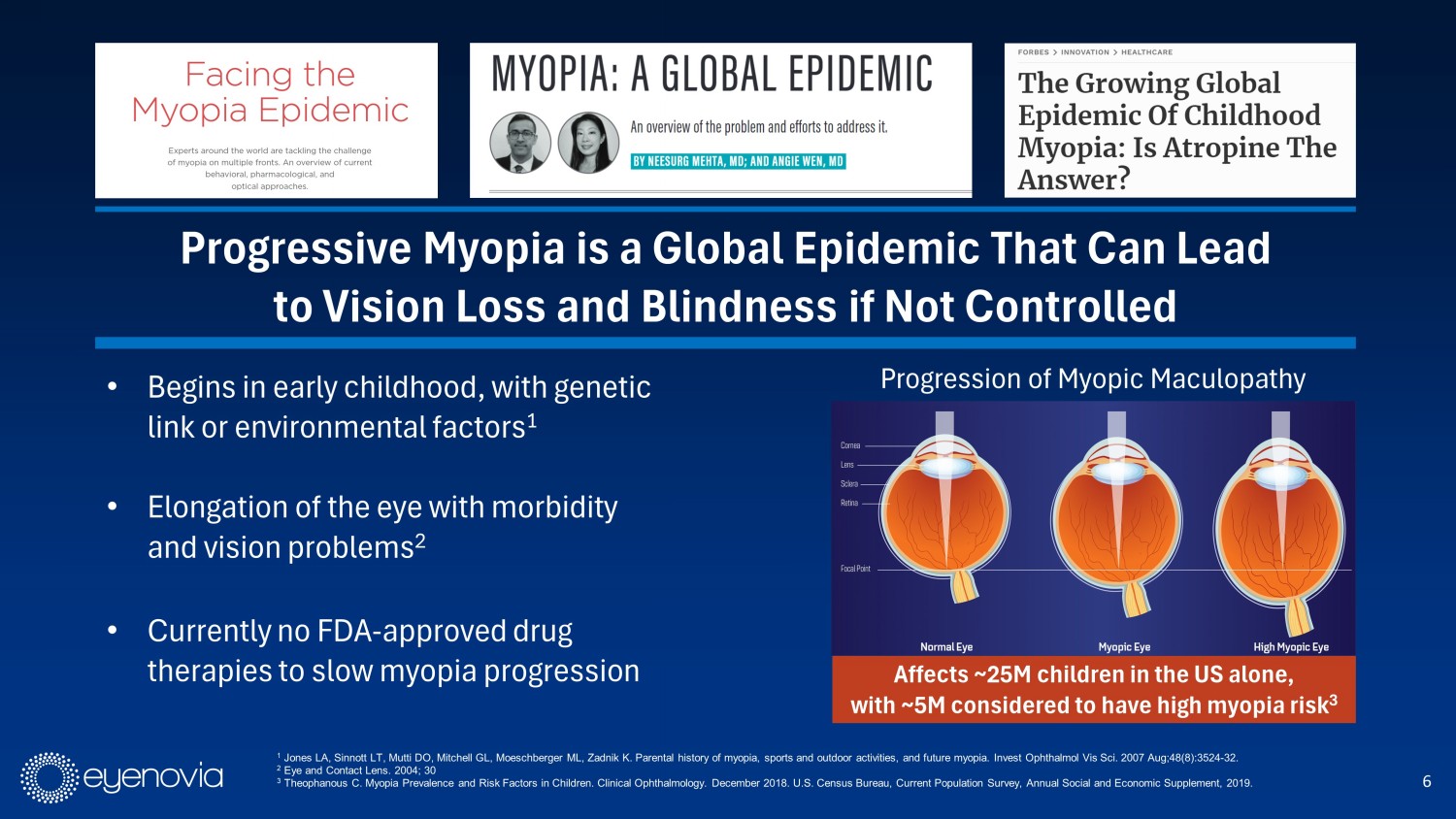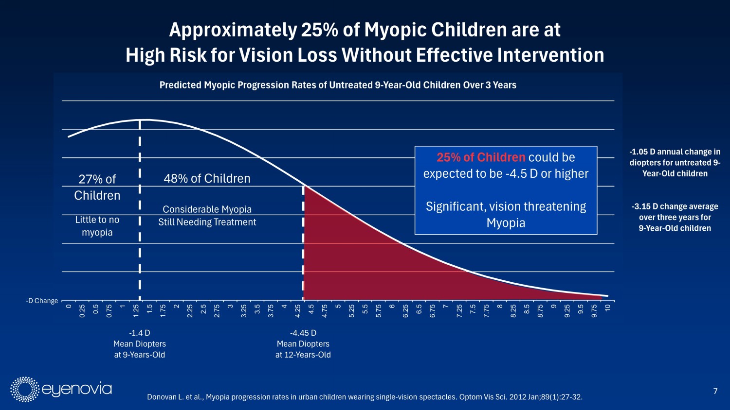 6 • Begins in early childhood, with genetic link or environmental factors 1 • Elongation of the eye with morbidity and vision problems 2 • Currently no FDA - approved drug therapies to slow myopia progression Affects ~25M children in the US alone, with ~5M considered to have high myopia risk 3 1 Jones LA, Sinnott LT, Mutti DO, Mitchell GL, Moeschberger ML, Zadnik K. Parental history of myopia, sports and outdoor activities, and future myopia. Invest Ophthalmol Vis Sci. 2007 Aug;48(8):3524 - 32. 2 Eye and Contact Lens. 2004; 30 3 Theophanous C. Myopia Prevalence and Risk Factors in Children. Clinical Ophthalmology. December 2018. U.S. Census Bureau, Cur re nt Population Survey, Annual Social and Economic Supplement, 2019. Progressive Myopia is a Global Epidemic That Can Lead to Vision Loss and Blindness if Not Controlled Progression of Myopic Maculopathy