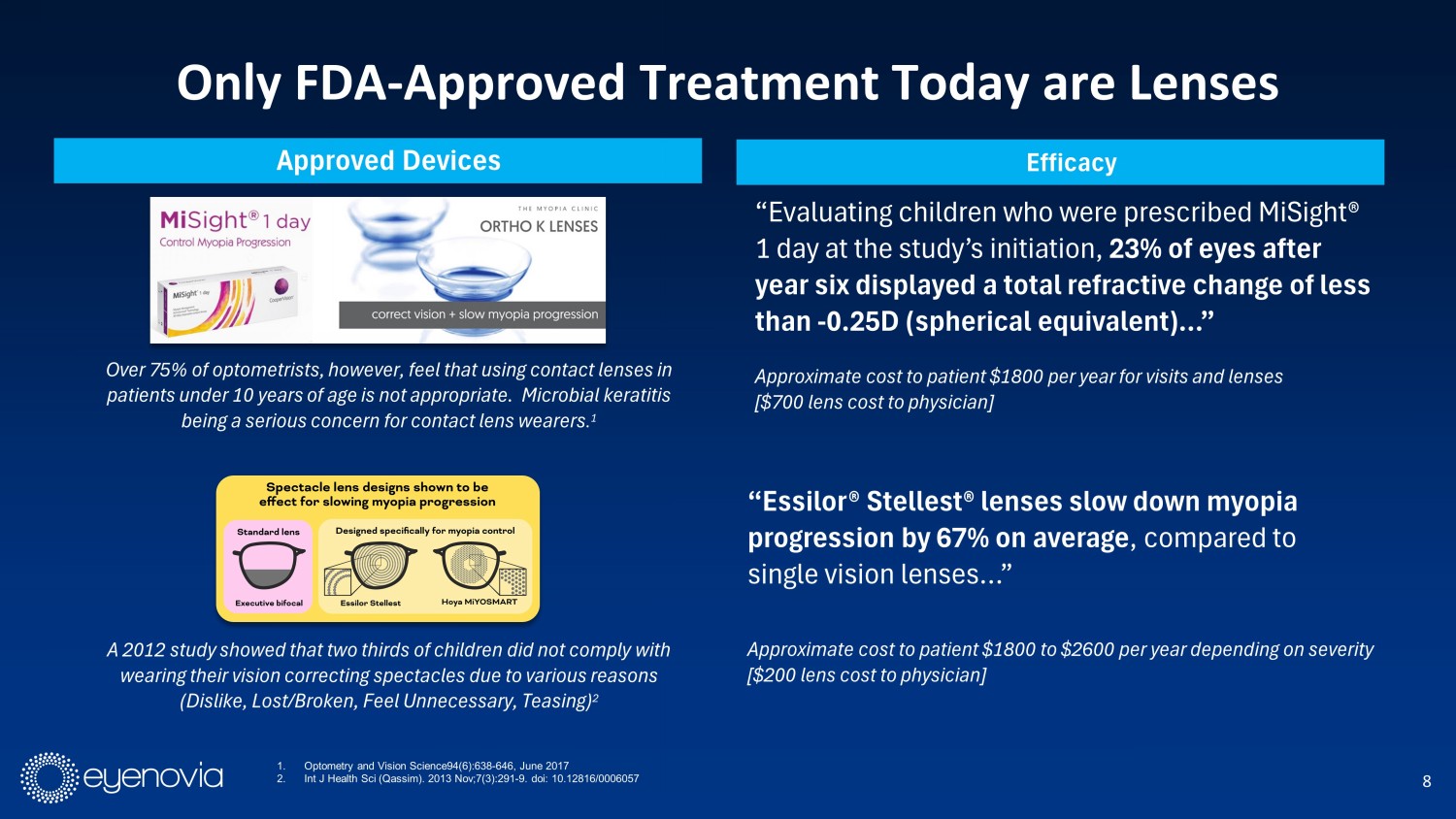 7 Approximately 25% of Myopic Children are at High Risk for Vision Loss Without Effective Intervention - 1.4 D Mean Diopters at 9 - Years - Old Donovan L. et al., Myopia progression rates in urban children wearing single - vision spectacles. Optom Vis Sci. 2012 Jan;89(1):27 - 32. 0 0.25 0.5 0.75 1 1.25 1.5 1.75 2 2.25 2.5 2.75 3 3.25 3.5 3.75 4 4.25 4.5 4.75 5 5.25 5.5 5.75 6 6.25 6.5 6.75 7 7.25 7.5 7.75 8 8.25 8.5 8.75 9 9.25 9.5 9.75 10 Predicted Myopic Progression Rates of Untreated 9 - Year - Old Children Over 3 Years - 4.45 D Mean Diopters at 12 - Years - Old 25% of Children could be expected to be - 4.5 D or higher Significant, vision threatening Myopia 48% of Children Considerable Myopia Still Needing Treatment 27% of Children Little to no myopia - 1.05 D annual change in diopters for untreated 9 - Year - Old children - 3.15 D change average over three years for 9 - Year - Old children - D Change