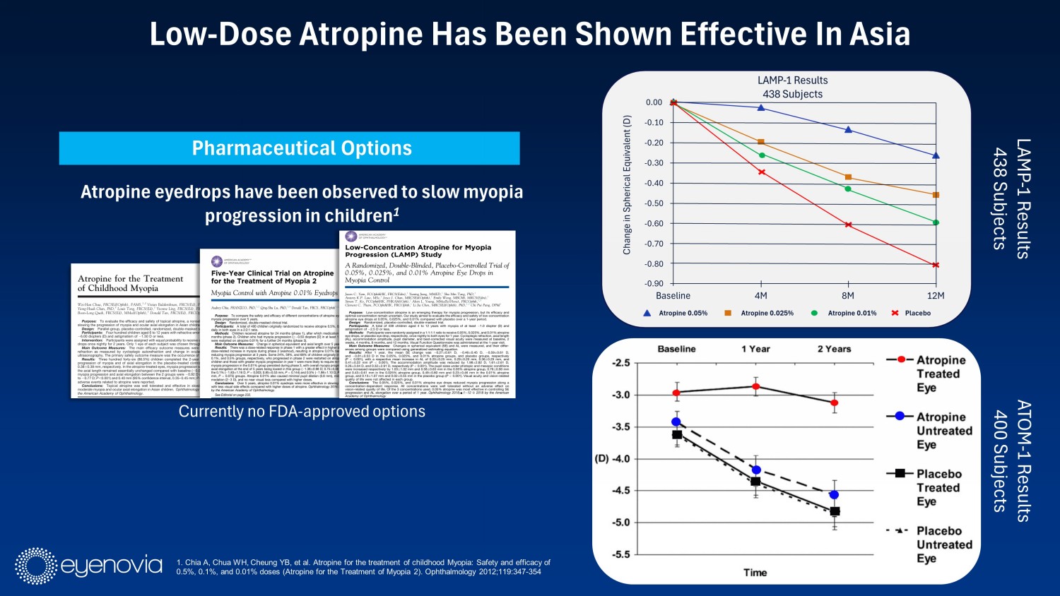 Pharmaceutical Options Atropine eyedrops have been observed to slow myopia progression in children 1 Currently no FDA - approved options Low - Dose Atropine Has Been Shown Effective In Asia 1. Chia A, Chua WH, Cheung YB, et al. Atropine for the treatment of childhood Myopia: Safety and efficacy of 0.5%, 0.1%, and 0.01% doses (Atropine for the Treatment of Myopia 2). Ophthalmology 2012;119:347 - 354 ATOM - 1 Results 400 Subjects LAMP - 1 Results 438 Subjects