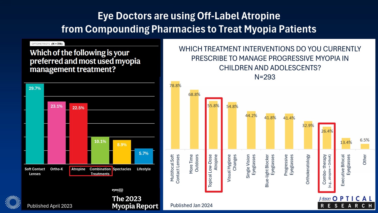Eye Doctors are using Off - Label Atropine from Compounding Pharmacies to Treat Myopia Patients Multifocal Soft Contact Lenses WHICH TREATMENT INTERVENTIONS DO YOU CURRENTLY PRESCRIBE TO MANAGE PROGRESSIVE MYOPIA IN CHILDREN AND ADOLESCENTS? More Time Outdoors Topical Low - Dose Atropine Visual Hygiene Changes Single Vision Eyeglasses Blue - light Blocker Eyeglasses Progressive Eyeglasses Orthokeratology Combo - therapy ( e.g., atropine + OrthoK) Executive Bifocal Eyeglasses Other Published April 2023 Published Jan 2024 N=293 29.7% 23.1% 22.5% 10.1% 8.9% 5.7% Soft Contact Lenses Ortho-K Atropine Combination Treatments Spectacles Lifestyle