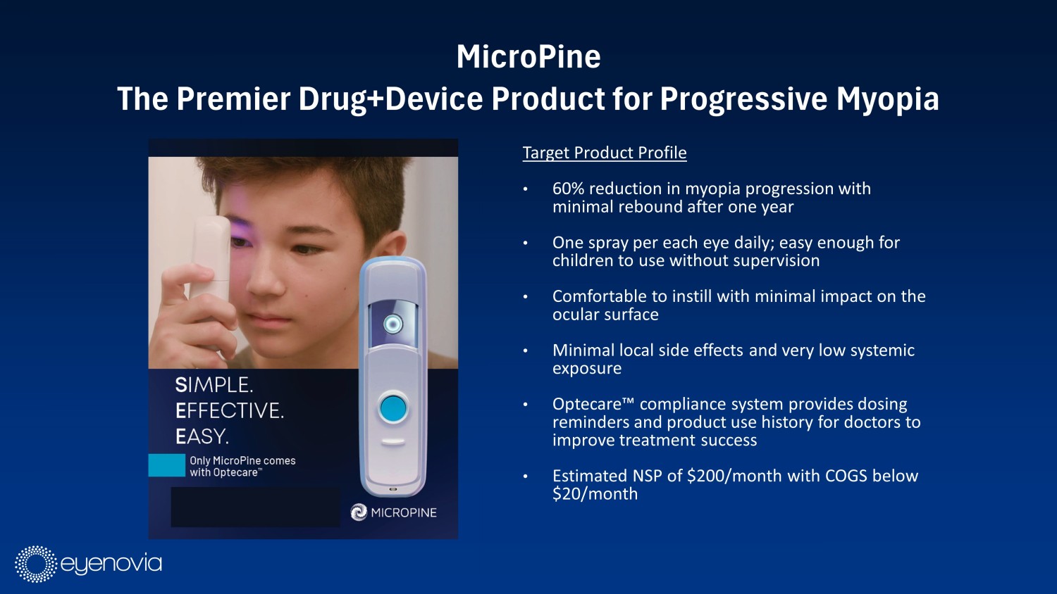 MicroPine The Premier Drug+Device Product for Progressive Myopia Target Product Profile • 60% reduction in myopia progression with minimal rebound after one year • One spray per each eye daily; easy enough for children to use without supervision • Comfortable to instill with minimal impact on the ocular surface • Minimal local side effects and very low systemic exposure • Optecare Ρ compliance system provides dosing reminders and product use history for doctors to improve treatment success • Estimated NSP of $200/month with COGS below $20/month