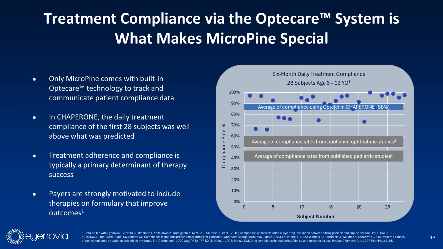 ● Only MicroPine comes with built - in Optecare Ρ technology to track and communicate patient compliance data ● In CHAPERONE, the daily treatment compliance of the first 28 subjects was well above what was predicted ● Treatment adherence and compliance is typically a primary determinant of therapy success ● Payers are strongly motivated to include therapies on formulary that improve outcomes 1 13 Treatment Compliance via the Optecare Ρ System is What Makes MicroPine Special 1 Data on file with Eyenovia. 2 Naito 2018: Naito T, Yoshikawa K, Namiguchi K, Mizoue S, Shiraishi A, et al. (2018) Comparison of success rates in eye drop instillation between sitting position and supine position. PLOS ONE 13 (9): e0204363. Patel 1995: Patel SC, Spaeth GL. Compliance in patients prescribed eyedrops for glaucoma. Ophthalmic Surg. 1995 May - Ju n;26(3):233 - 6. Winfield, 1990: Winfield AJ, Jessiman D, Williams A, Esakowitz L. A study of the causes of non - compliance by patients prescribed eyedrops. Br J Ophthalmol . 1990 Aug;74(8):477 - 80. 3. Matsui, 1997: Matsui DM. Drug compliance in pediatrics. Clinical and research issues. Pediatr Clin North Am. 1997 Feb;44(1):1 - 14.