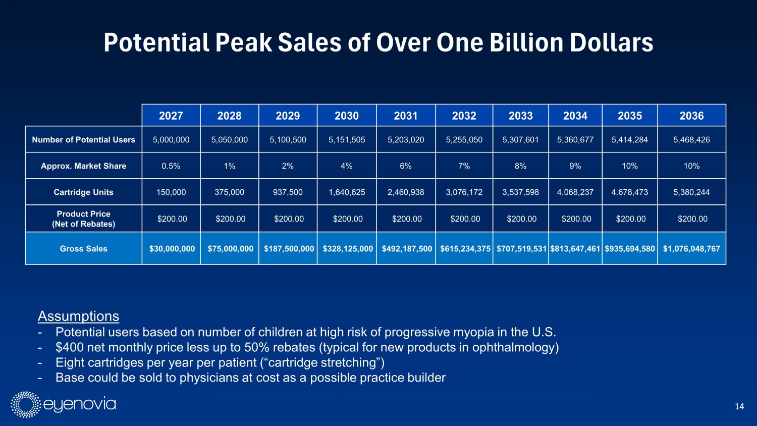 14 Potential Peak Sales of Over One Billion Dollars 2027 2028 2029 2030 2031 2032 2033 2034 2035 2036 Number of Potential Users 5,000,000 5,050,000 5,100,500 5,151,505 5,203,020 5,255,050 5,307,601 5,360,677 5,414,284 5,468,426 Approx. Market Share 0.5% 1% 2% 4% 6% 7% 8% 9% 10% 10% Cartridge Units 150,000 375,000 937,500 1,640,625 2,460,938 3,076,172 3,537,598 4,068,237 4.678,473 5,380,244 Product Price (Net of Rebates) $200.00 $200.00 $200.00 $200.00 $200.00 $200.00 $200.00 $200.00 $200.00 $200.00 Gross Sales $30,000,000 $75,000,000 $187,500,000 $328,125,000 $492,187,500 $615,234,375 $707,519,531 $813,647,461 $935,694,580 $1,076,048,767 Assumptions - Potential users based on number of children at high risk of progressive myopia in the U.S. - $400 net monthly price less up to 50% rebates (typical for new products in ophthalmology) - Eight cartridges per year per patient (“cartridge stretching”) - Base could be sold to physicians at cost as a possible practice builder