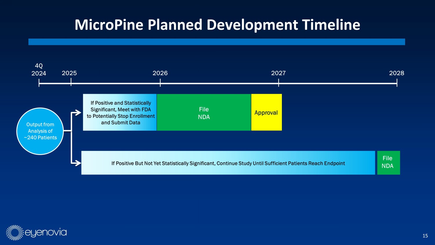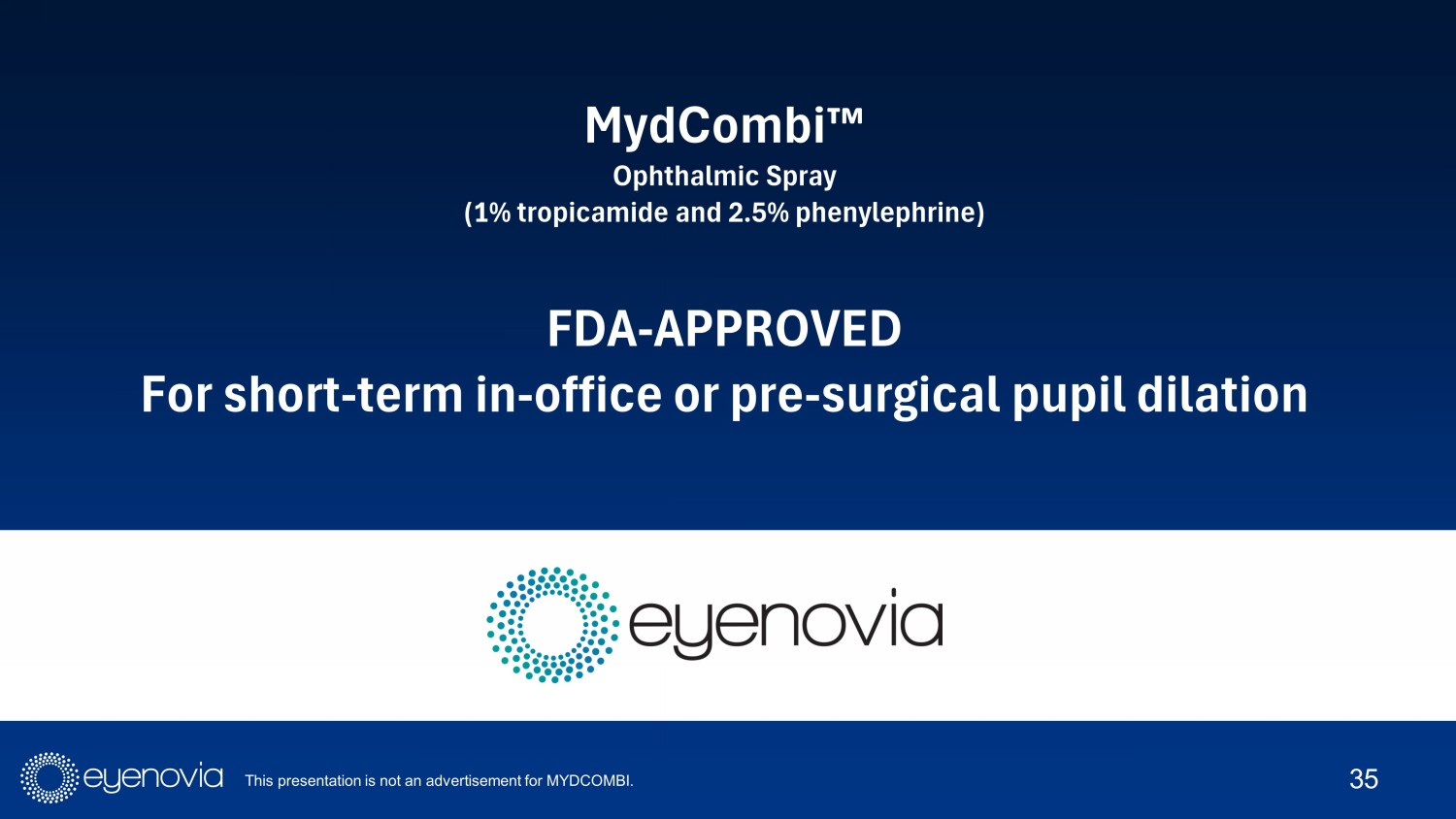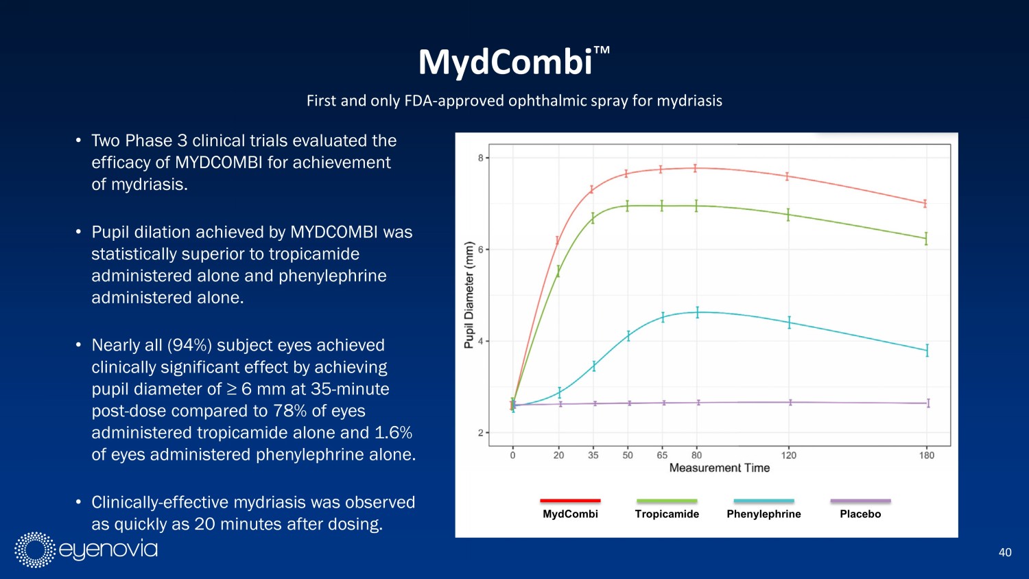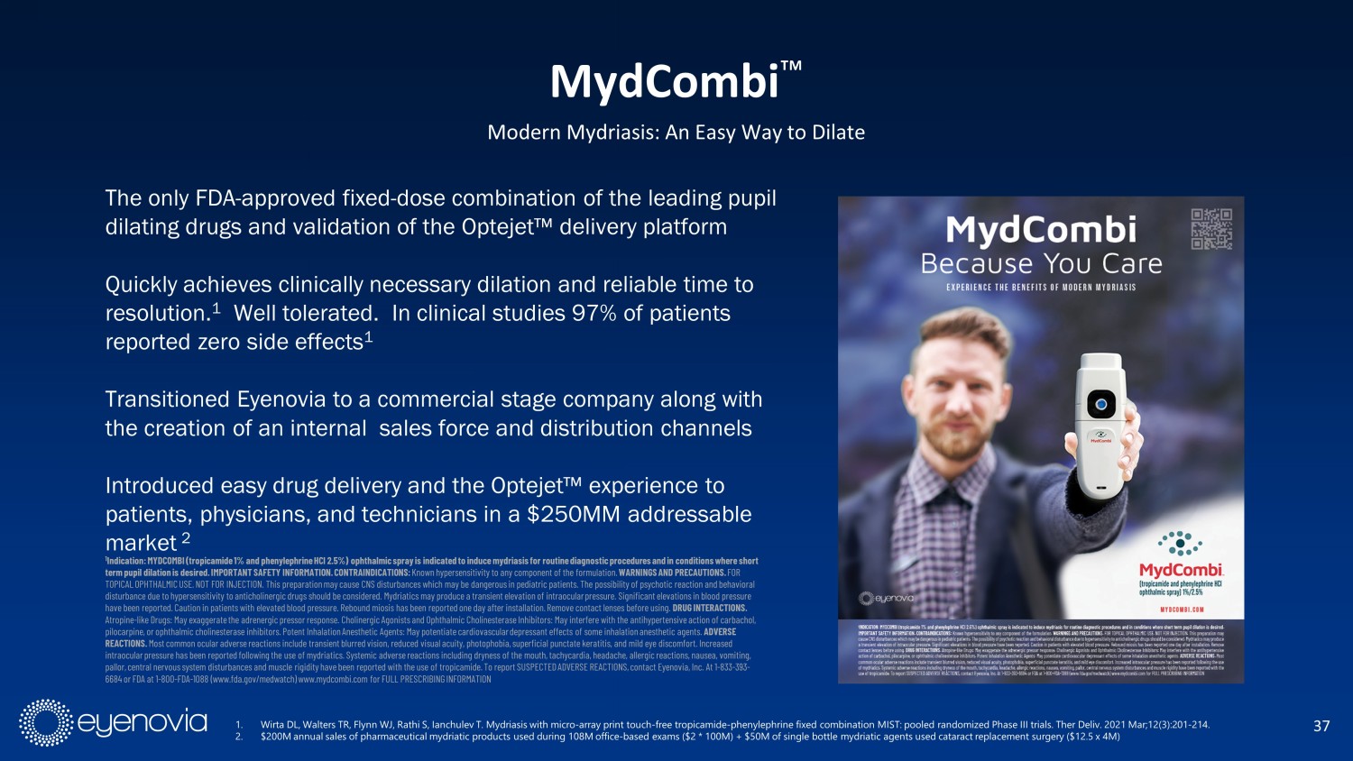 37 MydCombi Ρ Modern Mydriasis: An Easy Way to Dilate 1 Indication: MYDCOMBI (tropicamide 1% and phenylephrine HCl 2.5%) ophthalmic spray is indicated to induce mydriasis for routin e d iagnostic procedures and in conditions where short term pupil dilation is desired. IMPORTANT SAFETY INFORMATION. CONTRAINDICATIONS: Known hypersensitivity to any component of the formulation. WARNINGS AND PRECAUTIONS. FOR PRECAUTIONS. FOR TOPICAL OPHTHALMIC USE. NOT FOR INJECTION. This preparation may cause CNS disturbances which may be dangerous in pediatri c p atients. The possibility of psychotic pediatric patients. The possibility of psychotic reaction and behavioral disturbance due to hypersensitivity to anticholinerg ic drugs should be considered. Mydriatics may produce a transient considered. Mydriatics may produce a transient elevation of intraocular pressure. Significant elevations in blood pressure ha ve been reported. Caution in patients with elevated blood pressure. in patients with elevated blood pressure. Rebound miosis has been reported one day after installation. Remove contact lenses bef ore using. DRUG INTERACTIONS. Atropine - like Drugs: May INTERACTIONS. Atropine - like Drugs: May exaggerate the adrenergic pressor response. Cholinergic Agonists and Ophthalmic Cholinesterase Inhibito rs: May interfere with the antihypertensive action of carbachol, pilocarpine, or ophthalmic cholinesterase inhibitors. Potent Inhalation Anesthetic Agents: May potentiat e c ardiovascular depressant effects of some inhalation anesthetic agents. ADVERSE REACTIONS. Most common ocular adverse reactions include transient blurred vision, reduced visual acuity, photophobia, superficial puncta te keratitis, and mild eye discomfort. Increased intraocular pressure has been reported following the use of mydriatics. Systemic adverse reactions including drynes s o f the mouth, tachycardia, headache, allergic reactions, nausea, vomiting, pallor, central nervous system disturbances and muscle rigidity have been reported with the use of tropicamide. To rep ort SUSPECTED ADVERSE REACTIONS, contact Eyenovia, Inc. At 1 - 833 - 393 - 6684 or FDA at 1 - 800 - FDA - 1088 (www.fda.gov/medwatch) www.mydcombi.com for FULL PRESCRIBING INFORMATION The only FDA - approved fixed - dose combination of the leading pupil dilating drugs and validation of the Optejet Œ delivery platform Quickly achieves clinically necessary dilation and reliable time to resolution. 1 Well tolerated. In clinical studies 97% of patients reported zero side effects 1 Transitioned Eyenovia to a commercial stage company along with the creation of an internal sales force and distribution channels Introduced easy drug delivery and the Optejet Œ experience to patients, physicians, and technicians in a $250MM addressable market 2 1. Wirta DL, Walters TR, Flynn WJ, Rathi S, Ianchulev T. Mydriasis with micro - array print touch - free tropicamide - phenylephrine fixed combination MIST: pooled randomized Phase III tr ials. Ther Deliv . 2021 Mar;12(3):201 - 214. 2. $200M annual sales of pharmaceutical mydriatic products used during 108M office - based exams ($2 * 100M) + $50M of single bottle mydriatic agents used cataract replacement surgery ($12.5 x 4M)