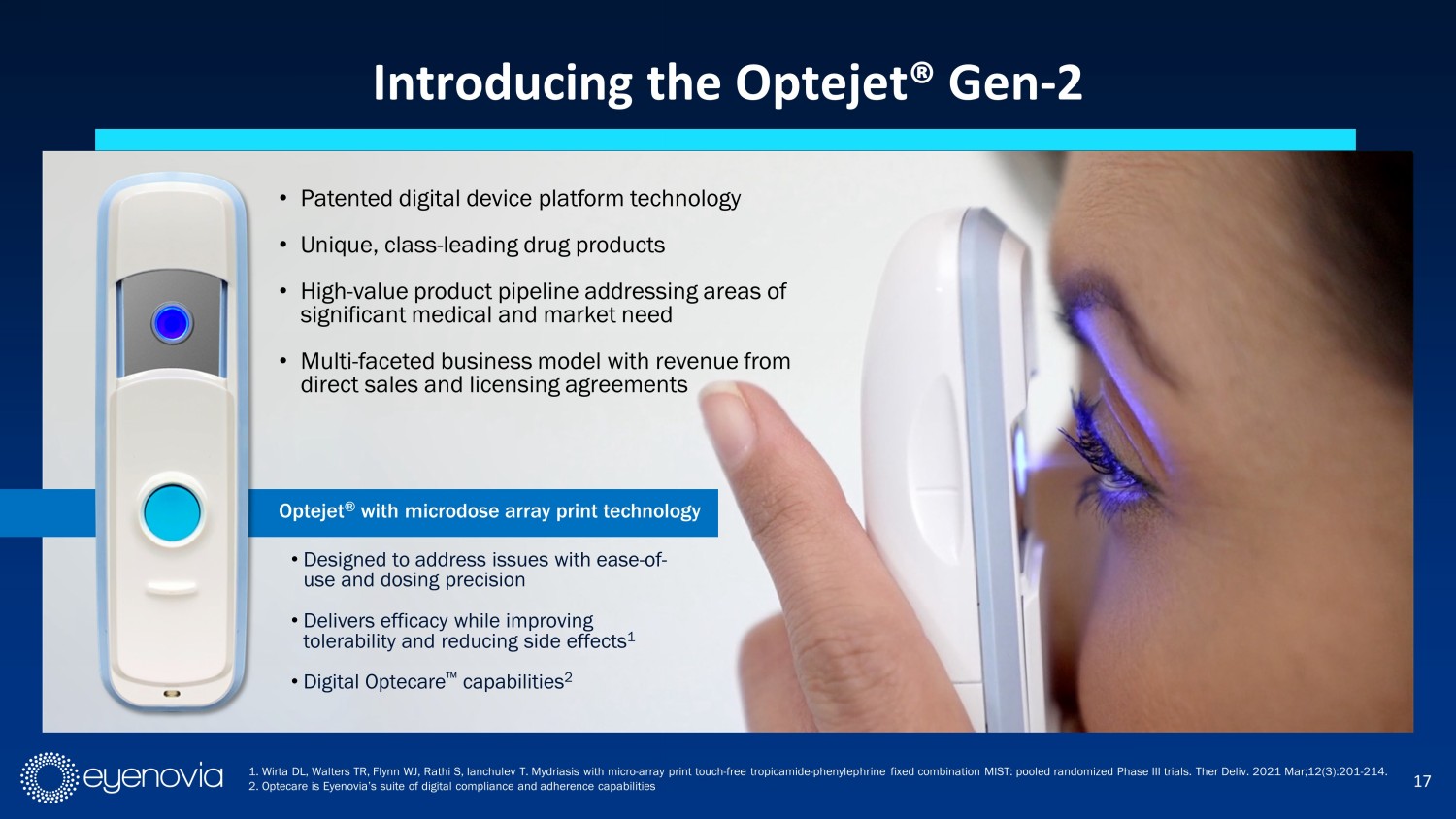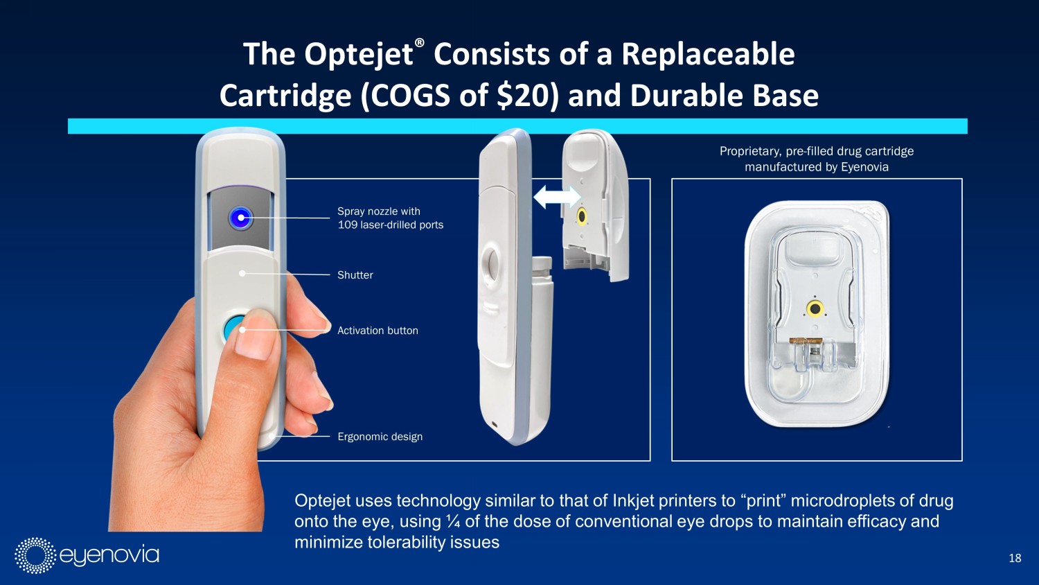 17 • Designed to address issues with ease - of - use and dosing precision • Delivers efficacy while improving tolerability and reducing side effects 1 • Digital Optecare Œ capabilities 2 Optejet ® with microdose array print technology • Patented digital device platform technology • Unique, class - leading drug products • High - value product pipeline addressing areas of significant medical and market need • Multi - faceted business model with revenue from direct sales and licensing agreements Introducing the Optejet® Gen - 2 1. Wirta DL, Walters TR, Flynn WJ, Rathi S, Ianchulev T. Mydriasis with micro - array print touch - free tropicamide - phenylephrine f ixed combination MIST: pooled randomized Phase III trials. Ther Deliv. 2021 Mar;12(3):201 - 214. 2. Optecare is Eyenovia’s suite of digital compliance and adherence capabilities