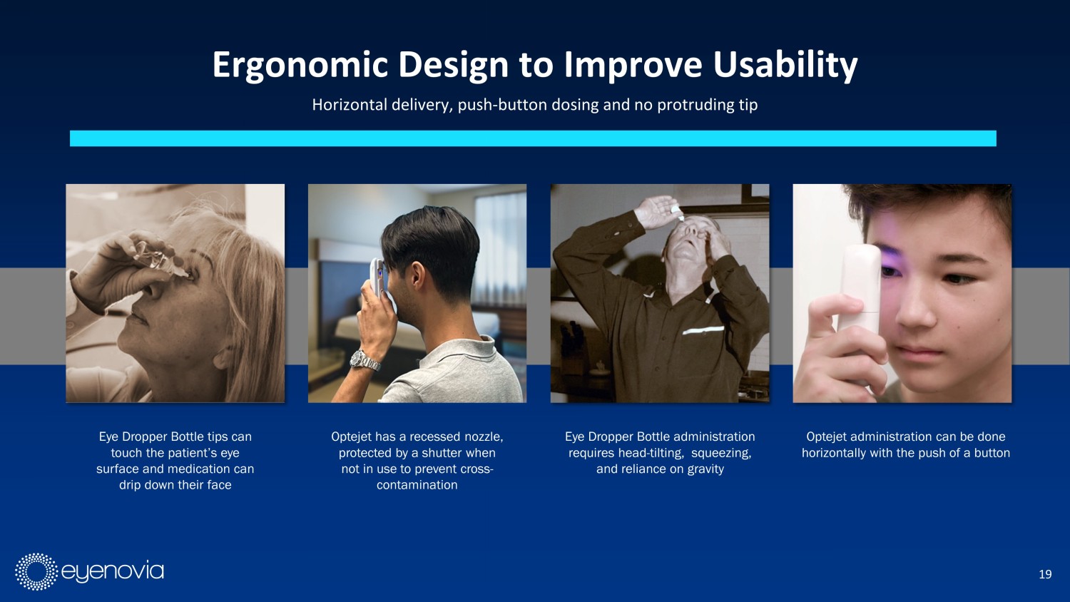 18 The Optejet ® Consists of a Replaceable Cartridge (COGS of $20) and Durable Base Spray nozzle with 109 laser - drilled ports Shutter Activation button Ergonomic design Proprietary, pre - filled drug cartridge manufactured by Eyenovia Optejet uses technology similar to that of Inkjet printers to “print” microdroplets of drug onto the eye, using ¼ of the dose of conventional eye drops to maintain efficacy and minimize tolerability issues