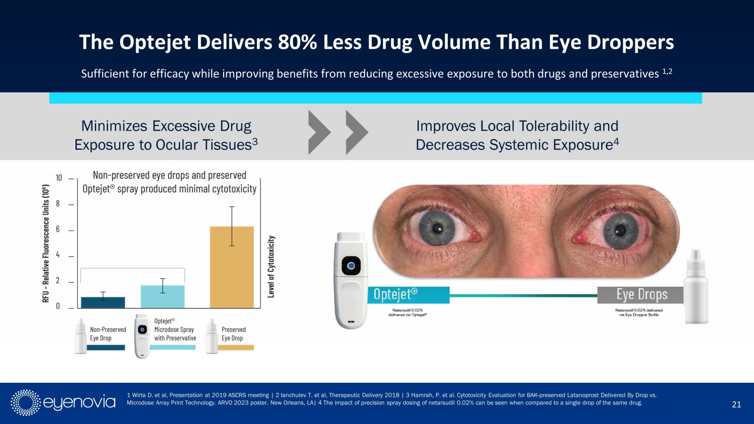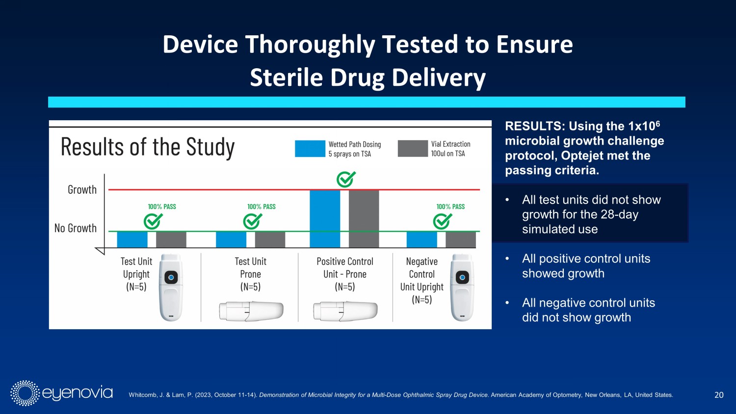 20 Device Thoroughly Tested to Ensure Sterile Drug Delivery RESULTS: Using the 1x10 6 microbial growth challenge protocol, Optejet met the passing criteria. • All test units did not show growth for the 28 - day simulated use • All positive control units showed growth • All negative control units did not show growth Whitcomb, J. & Lam, P. (2023, October 11 - 14). Demonstration of Microbial Integrity for a Multi - Dose Ophthalmic Spray Drug Device. American Academy of Optometry, New Orleans, LA, United States.